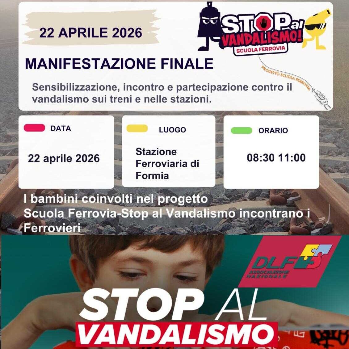 L’iniziativa si è sviluppata grazie alla positiva sinergia tra il DLF Formia, le istituzioni scolastiche, gli Enti del territorio e le realtà del Gruppo FS in percorso di educazione alla cittadinanza attiva, al rispetto delle regole e alla tutela del bene comune.