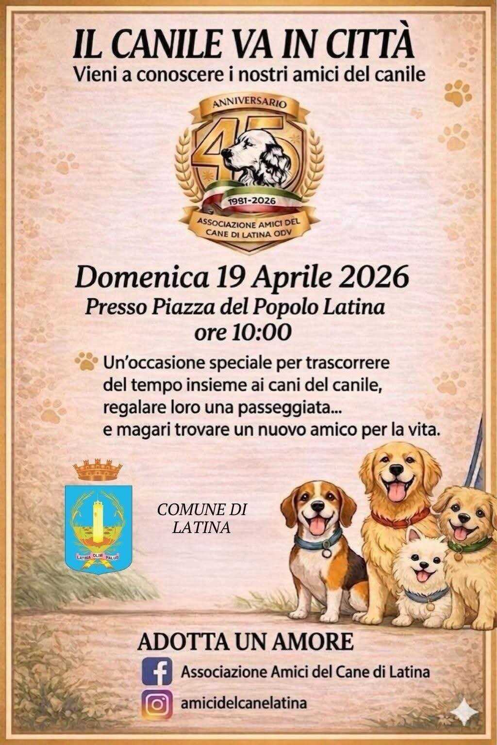 LATINA – I cani del canile di Latina incontreranno i cittadini, domenica 19 aprile 2026, in Piazza del popolo a Latina. L’iniziativa è organizzata e realizzata dall’associazione Amici del Cane di Latina che gestisce la struttura della Chiesuola, con il patrocinio del Comune.