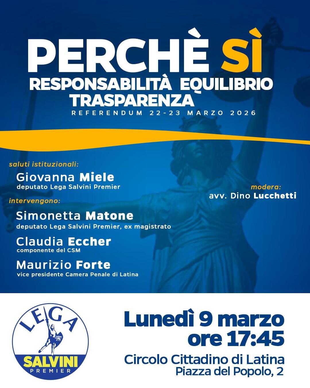 Sempre nel pomeriggio di lunedì 9 marzo, stavolta al Circolo cittadino, si terrà invece l’incontro dal titolo “Referendum, perché sì”, promosso dalla Lega (ore 17.45). Parteciperanno con l’onorevole Giovanna Miele che ne è stata promotrice e che porterà i saluti istituzionali, l’ex magistrata Simonetta Matone, parlamentare della Lega, Claudia Eccher, consigliera laica del Csm, e Maurizio Forte vicepresidente della Camera Penale di Latina. Modera l’avvocato del Foro di Latina, Dino Lucchetti.