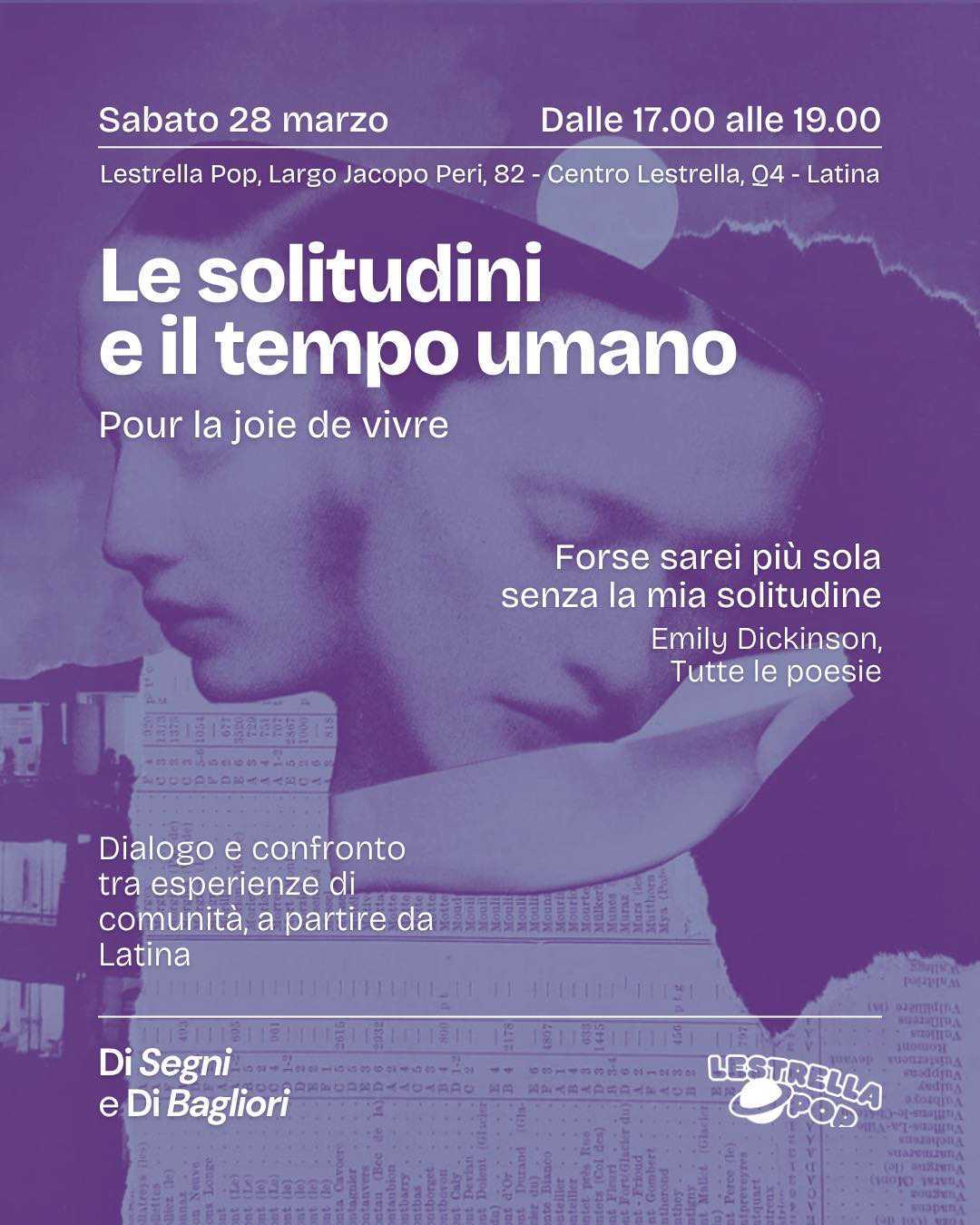 LATINA – Prosegue il programma di incontri a Lestrella Pop. Sabato 28 marzo dalle 17.00 alle 19.00, nello spazio del centro culturale in Largo Jacopo Peri 82, nel quartiere Q4 a Latina, il tema, sarà “Le solitudini e il tempo umano” inziativa realizzata in collaborazione con “Di Segni e di Bagliori“.