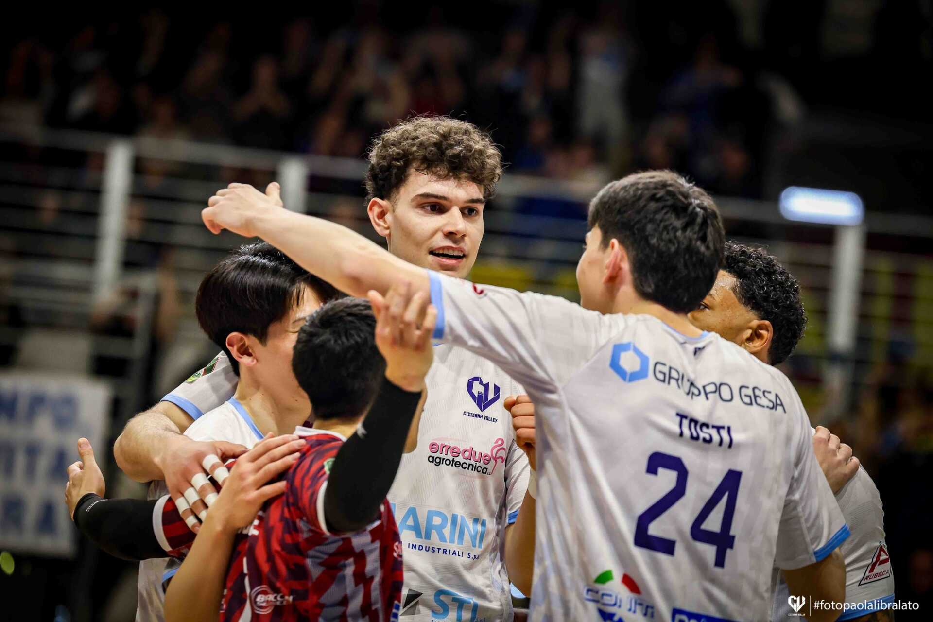 Senza Sabbi, rimasto a Cisterna per proseguire con la fisioterapia, in avvio di match coach Tubertini schiera Sottile in palleggio opposto a Onwuelo, laterali Tillie e Randazzo, con Szwarc e Rossi al centro e Cavaccini libero, poi nel corso della sfida spazio a Seganov al posto di Sottile e Cavuto per Onwuelo con Rondoni e Rossato impegnati durante il match, quest’ultimo protagonista anche di un ace al primo servizio nella sua carriera nella massima serie.