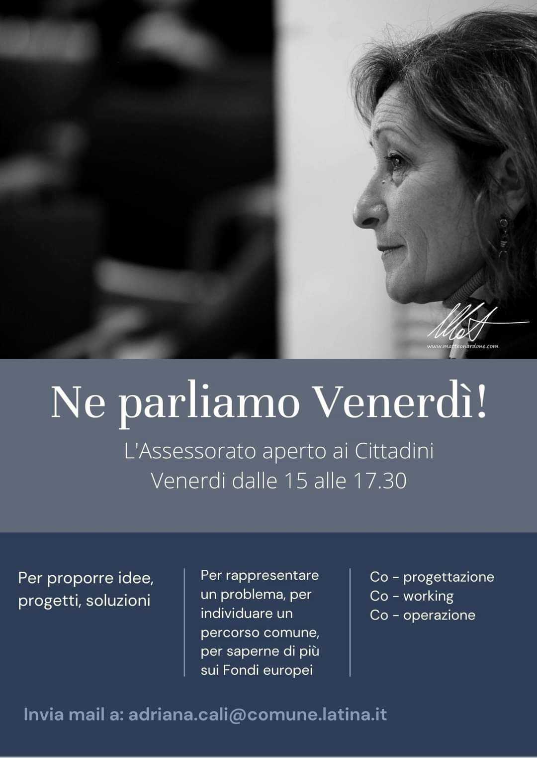 LATINA – Si chiama “Ne parliamo Venerdì”, l’iniziativa lanciata dall’assessora alla Transizione Ecologica, Ambiente, Politiche Energetiche, Ufficio Europa e Marina, del Comune di Latina, Adriana Calì, che ha deciso di aprire le porte del suo ufficio all’ascolto dei cittadini.