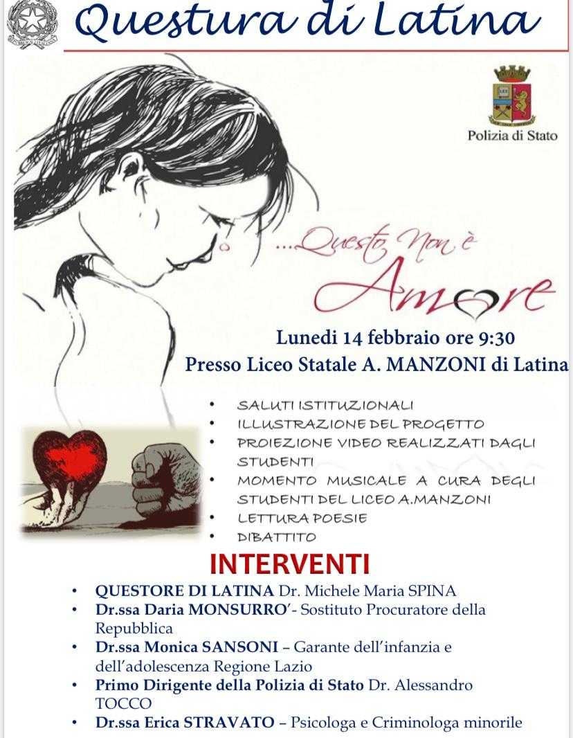Al Liceo Manzoni di Latina, alle 9,30, il questore di Latina Michele Spina incontrerà gli studenti per illustrare il progetto e parlare del delicato tema insieme ad alcuni esperti tra cui la Sostituta della Procura della Repubblica di Latina Daria Monsurrò, che si occupa da anni di reati di genere e sui minori, ma anche con la Garante dell’Infanzia e dell’adolescenza del Lazio Monica Sansoni, con il primo dirigente della Questura di Latina Alessandro Tocco e la psicologa e criminologa Erica Stravato. Al centro della mattinata il dialogo con i ragazzi, per parlare dei diversi aspetti del fenomeno a partire dall’importanza di riconoscerlo, e per offrire loro punti di riferimento tra le istituzioni.