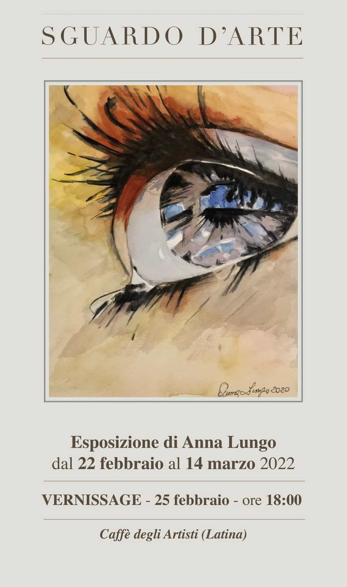 LATINA – “Sguardo d’arte” è la mostra della professoressa Anna Lungo che si terrà a Latina dal 22 febbraio al 14 marzo 2022.