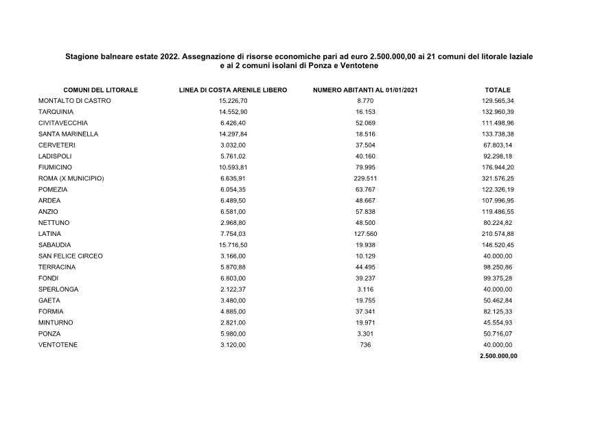 La somma verrà ripartita tra 21 Comuni costieri, di cui 11 pontini e tra questi le isole di Ponza e Ventotene che riceveranno da un minimo di 40mila euro (Sperlonga e Ventotene) a un massimo di 210mila (Latina), calcolati sulla base del numero di abitanti e della lunghezza di arenile disponibile (spiagge libere e libere con servizi). (vedi tabella)
