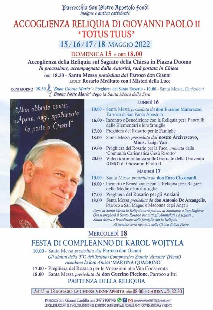 FONDI – L’ampolla con il sangue reliquia di San Giovanni Paolo II arriverà domenica 15 maggio a Fondi per aprire quattro giornate di fede per il grande Papa polacco nel Duomo di San Pietro apostolo. La cerimonia di accoglienza fissata per le ore 18,00 nel Duomo di San Pietro apostolo dove la reliquia del santo rimarrà fino a mercoledì 18 maggio.