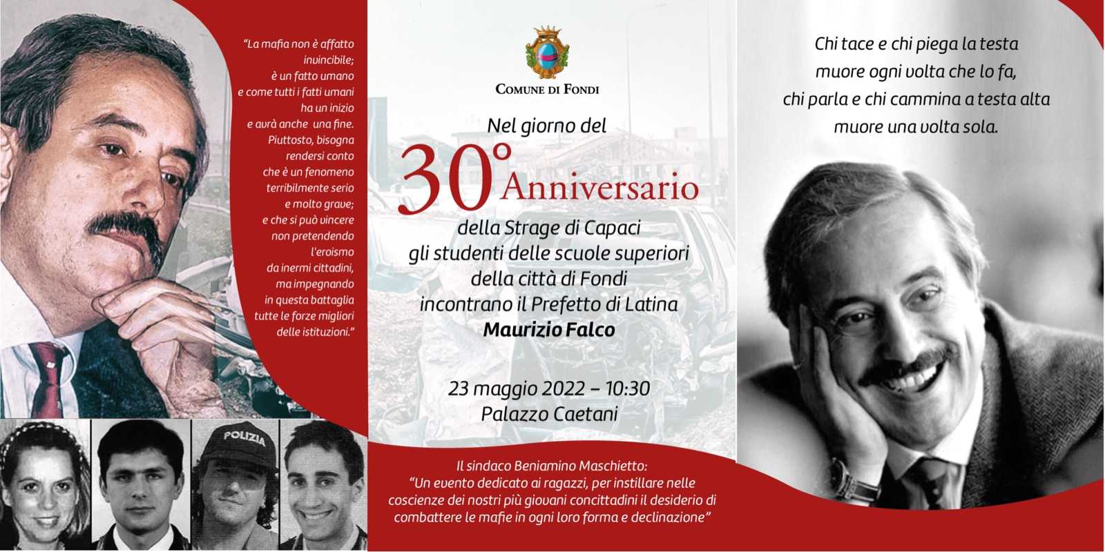 FONDI – È dedicato a tutti gli studenti delle scuole superiori della città, allo scopo di informare, prevenire e sensibilizzare, l’evento organizzato dal Comune di Fondi in occasione del trentesimo anniversario della Strage di Capaci che ricorre lunedì 23 maggio. L’incontro, che vedrà la partecipazione straordinaria del prefetto di Latina Maurizio Falco, si terrà a partire dalle 10:30 a Palazzo Caetani e darà la possibilità ai ragazzi di esporre brevi riflessioni ma anche e soprattutto di fare domande sulla ricorrenza e, in generale, sul tema della malavita organizzata, purtroppo ancora di grande attualità.