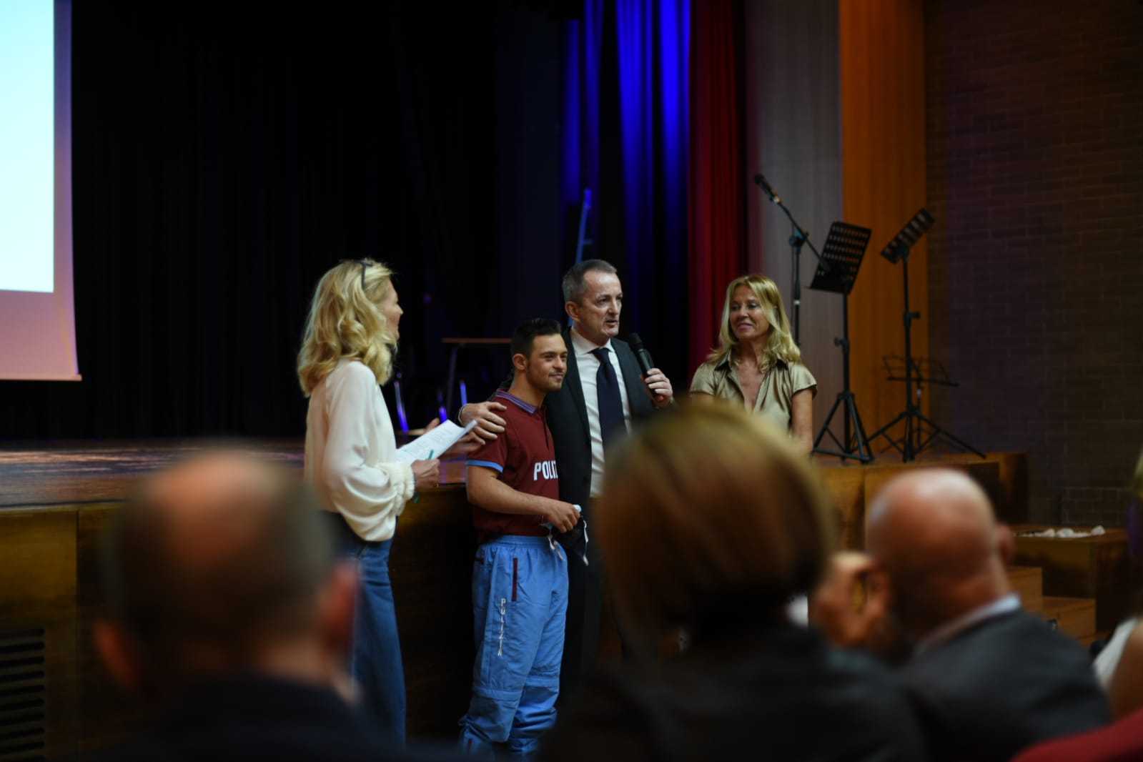 Durante la cerimonia il Questore Spina ha voluto presentare ai ragazzi il poliziotto ad honorem Valerio Catoia (entrambi nella foto a destra), il 21enne di Latina con sindrome di Down, divenuto Alfiere della Repubblica nel 2019 per aver salvato una bambina che stava per annegare nel mare di Sabaudia alla Bufalara.