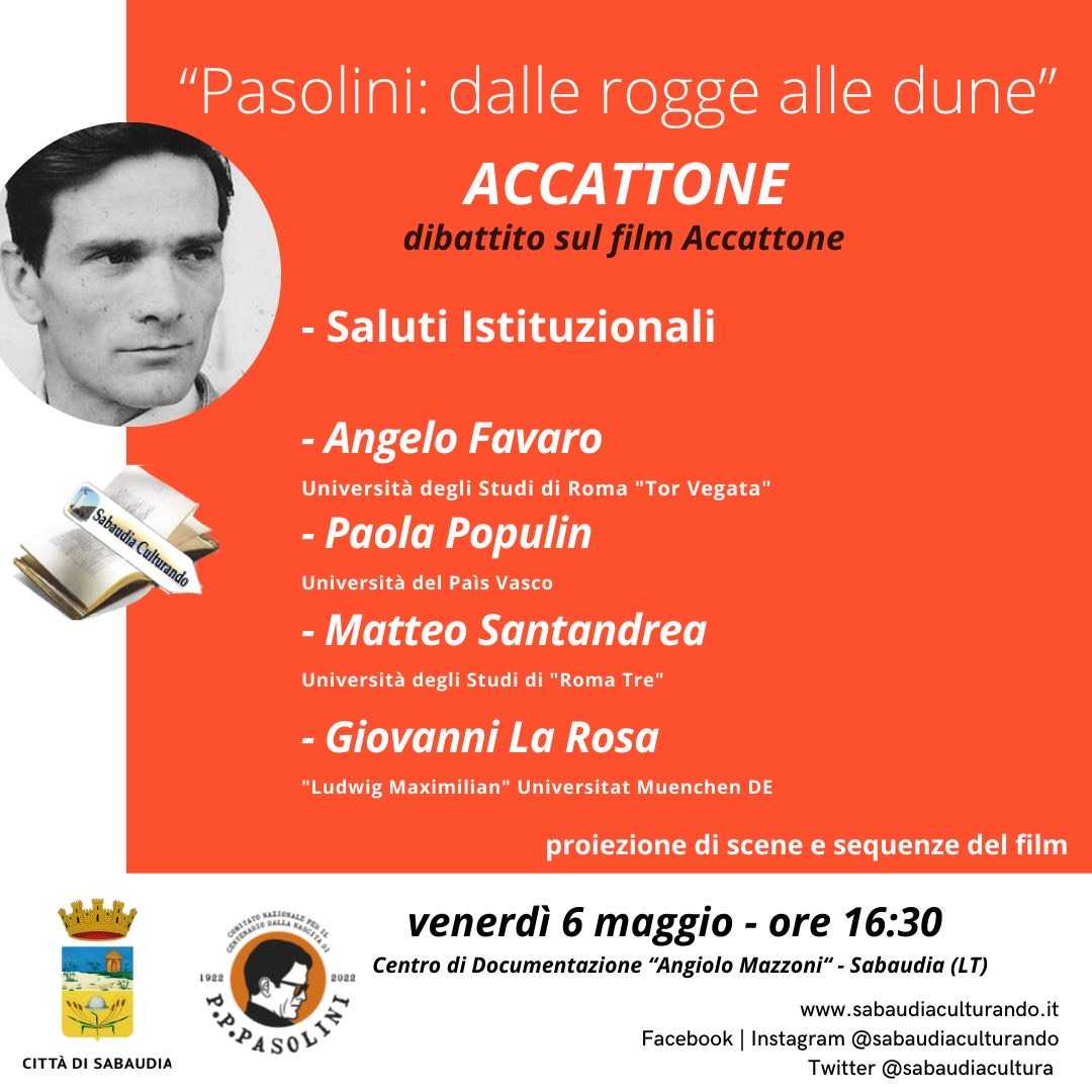 SABAUDIA – L’associazione Sabaudia Culturando, dopo il successo dei primi due appuntamenti che si sono svolti nei mesi di marzo e aprile, è pronta per un nuovo appuntamento del ciclo di incontri dal titolo “Pasolini: dalle rogge alle dune”.