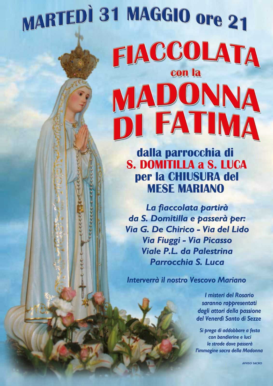 LATINA – Martedì 31 maggio (alle 21) torna a Latina, dopo l’interruzione dovuta alla pandemia, la fiaccolata di chiusura del mese dedicato alla Madonna. Otto parrocchie, che promuovono insieme l’iniziativa da 10 anni, riuniranno i fedeli per un momento di gioiosa preghiera, con la processione alla quale prenderà parte il vescovo di Latina Mariano Crociata.