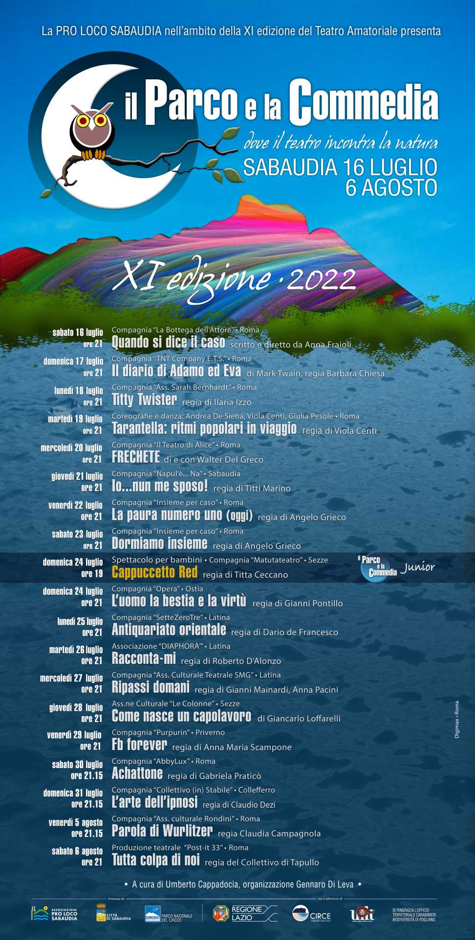 «Siamo arrivati alla XI edizione – come sottolineato dal direttore artistico Umberto Cappadocia – undici anni di racconti, comicità, divertimento, emozioni. È cominciato tutto per gioco e con il tempo è diventato un faticoso ma piacevole impegno, fatto con testa e cuore. Abbiamo trainato negli anni una carrozza piena di sogni, desideri, aspettative, a volte disattese altre ricche di contenuti. La passione per il Parco e la Commedia è cresciuta e ci ha coinvolto tutti. Questo evento ha sempre creato atmosfere magiche e uniche, amplificate dallo scenario del Parco nazionale del Circeo, luogo privilegiato, sospeso nello spazio e nel tempo, adatto a dare all’immaginazione il giusto respiro e licenza di esprimersi».