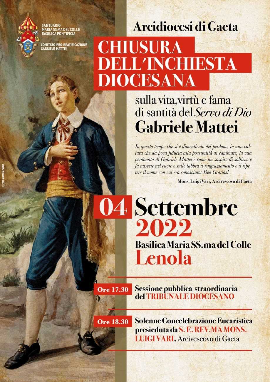 La chiusura del processo è stata annunciata dall’Arcivescovo di Gaeta Mons. Luigi Vari, in una lettera ai fedeli dell’Arcidiocesi del 7 luglio. “In questo tempo che tende ad inchiodare ognuno ai propri errori e che si è dimenticato del perdono, in una cultura che da poca fiducia alla possibilità di cambiare, la vita perdonata di Gabriele Mattei è come un sospiro di sollievo e fa nascere nel cuore e sulle labbra il ringraziamento e il ripetere il nome con cui era conosciuto: Deo Gratias”.