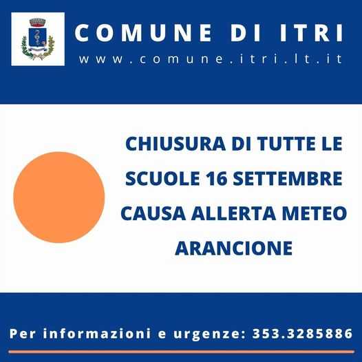 ITRI- Con l’allerta arancione e il prolungamento della criticità idrogeologica per temporali sulla provincia di Latina e su tutto il Lazio, visti i precedenti dello scorso anno con la frana che travolse il paese, il Comune di Itri ha disposto per la giornata di oggi, venerdì 16 settembre, la chiusura delle scuole di ogni ordine e grado del territorio comunale, l’annullamento del mercato settimanale e la chiusura dei centri sportivi. Tre ordinanze (le n.30, 31 e 32 del 15/9/2022) emesse nel tardo pomeriggio di ieri con l’obiettivo di scongiurare situazioni di pericolo per la cittadinanza alla quale viene chiesta “la massima collaborazione per la sicurezza di tutti”.