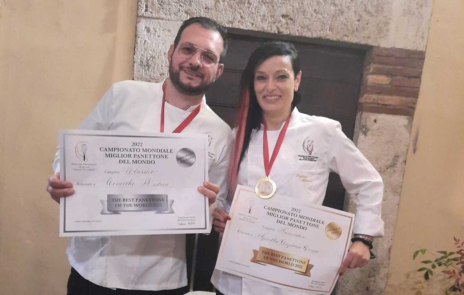 CORI – Il miglior panettone al mondo nasce a Cori. Lo dice la FIPGC (Federazione Internazionale Pasticceria Gelateria Cioccolateria) che ha assegnato al termine del Campionato Mondiale Miglior Panettone del Mondo 2022 la medaglia d’oro nella categoria ‘Innovativo’ con ‘Ambrosia’, ad Andrea Ceracchi e Tiziana Apicella, della pasticceria Maciste. Un panettone fatto con mosto di Nero Buono, vitigno tipico corese, visciole in frutto, olio EVO e cioccolato fondente, caratterizzato da una lievitazione ottenuta dalla fermentazione dei mosti.