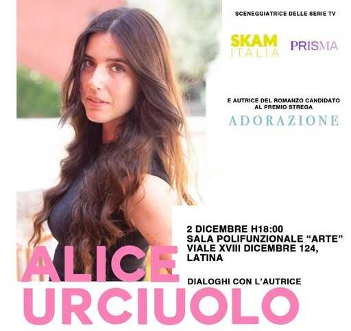 LATINA – Torna a Latina, la città in cui ha studiato e da cui è partita la sua avventura, la scrittrice pontina Alice Urciuolo. Venerdì pomeriggio (2 dicembre) dalle 18 alle 20, nello spazio giovani della sala polifunzionale “Arte” realizzata in viale XVIII Dicembre nell’ambito del progetto Latinadamare, la sceneggiatrice di serie di successo come Skam Italia e Prisma, quest’ultima ambientata tra Latina e Sabaudia, ha accettato l’invito per un aperitivo e una chiacchierata a 360° .