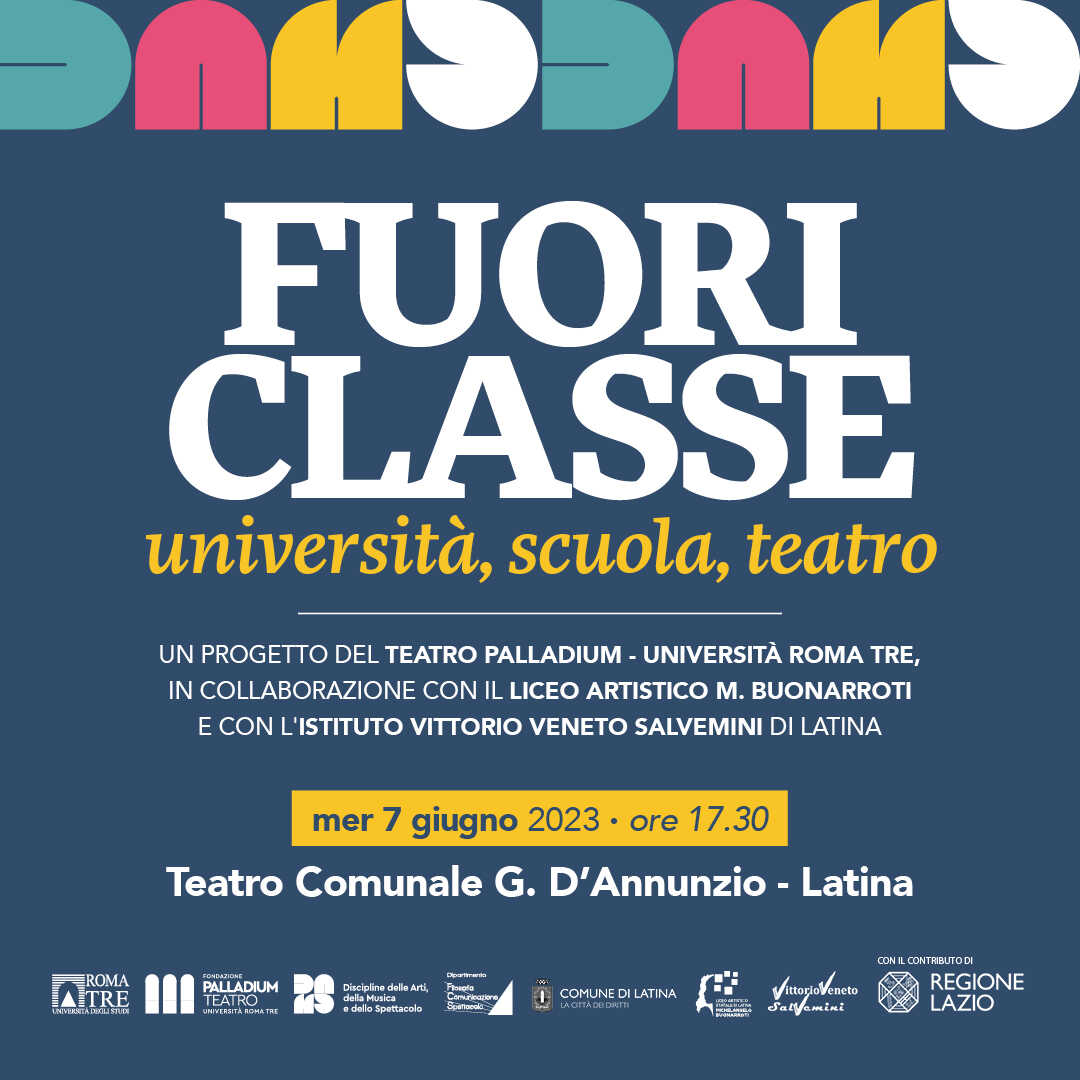 LATINA – Mercoledì 7 giugno alle ore 17.30 presso il Teatro Comunale G. D’Annunzio di Latina si terrà l’evento-spettacolo conclusivo del progetto FUORICLASSE, ideato e promosso dalla Fondazione Roma Tre Teatro Palladium in collaborazione con gli istituti di istruzione superiore “Vittorio Veneto Salvemini” e “Michelangelo Buonarroti” di Latina e con il DAMS dell’Università Roma Tre.