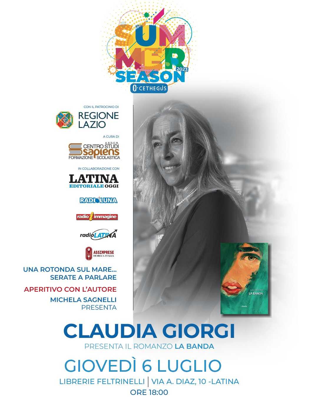 LATINA – “Una rotonda sul mare.. serate a parlare” è l’insieme di incontri con l’autore curati da Michela Sagnelli del Centro Studi Sapiens, in programma a Latina per la SummerSeason realizzata da Cethegus. Il prossimo è in programma giovedì 6 luglio e avrà come protagonista Claudia Giorgi con il suo ultimo romanzo “La banda”. L’appuntamento è alle 18 nella libreria Feltrinelli di Latina in via A. Diaz, 10.