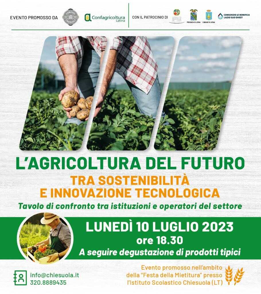 LATINA – Sostenibilità e innovazione tecnologica rappresentano la vera sfida del futuro per l’intero comparto agricolo ma sono senza dubbio obiettivi primari a cui tendere sin da oggi, affinché si possa giungere a sistemi sempre più virtuosi di produzione, in linea con le esigenze di un mercato in continua evoluzione e con una normativa nazionale ed europea che si fa ancor più stringente. Se ne parlerà lunedì 10 luglio alle ore 18.30 durante il convegno “L’agricoltura del futuro, tra sostenibilità e innovazione tecnologica”, promosso dall’Associazione Culturale Chiesuola e da Confagricoltura Latina nell’ambito della settima edizione della Festa della Mietitura, patrocinata da Consiglio Regionale del Lazio, Provincia di Latina, Comune di Latina e Consorzio di Bonifica Lazio Sud Ovest.