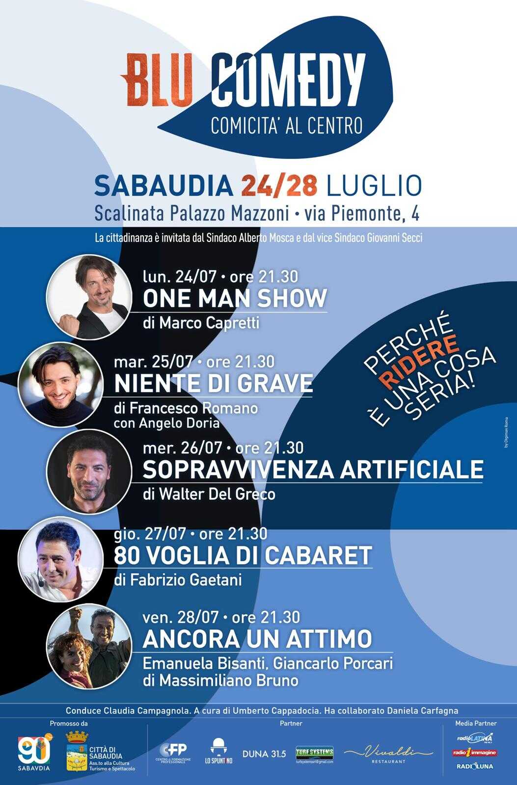 SABAUDIA – “Ridere è una cosa seria” . Con questo slogan si avvicina a Sabaudia Blu Comedy, cinque serate dal 24 al 28 luglio nel centro della città delle dune. Una rassegna che terrà compagnia con la leggerezza della risata a cittadini e turisti nell’ultima settimana di luglio, promossa dall’assessorato alla cultura del Comune, curata da Umberto Cappadocia con la collaborazione di Daniela Carfagna, madrina l’attrice Claudia Campagnola.
