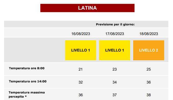 LATINA – Si intensifica il caldo, addio bollino verde che ci ha accompagnato per più di una settimana, oggi e domani resta su Latina il bollino giallo, ma venerdì 18 agosto diventerà arancione. E’ quanto ci dicono i bollettini delle ondate di calore del Ministero della Salute: dalla minima di oggi a 21 gradi e stato di preallerta si passerà ai 25° delle 8 di mattina di venerdì quando si entrerà nella fase critica con allerta dei servizi sanitari e sociali. La massima temperatura percepita in queste giornate varierà dai 36° di oggi ai 38 gradi centigradi del 18 agosto. I metereologi hanno chiamato questo anticiclone africano, Nerone, prevedendone la permanenza per circa 10 giorni.