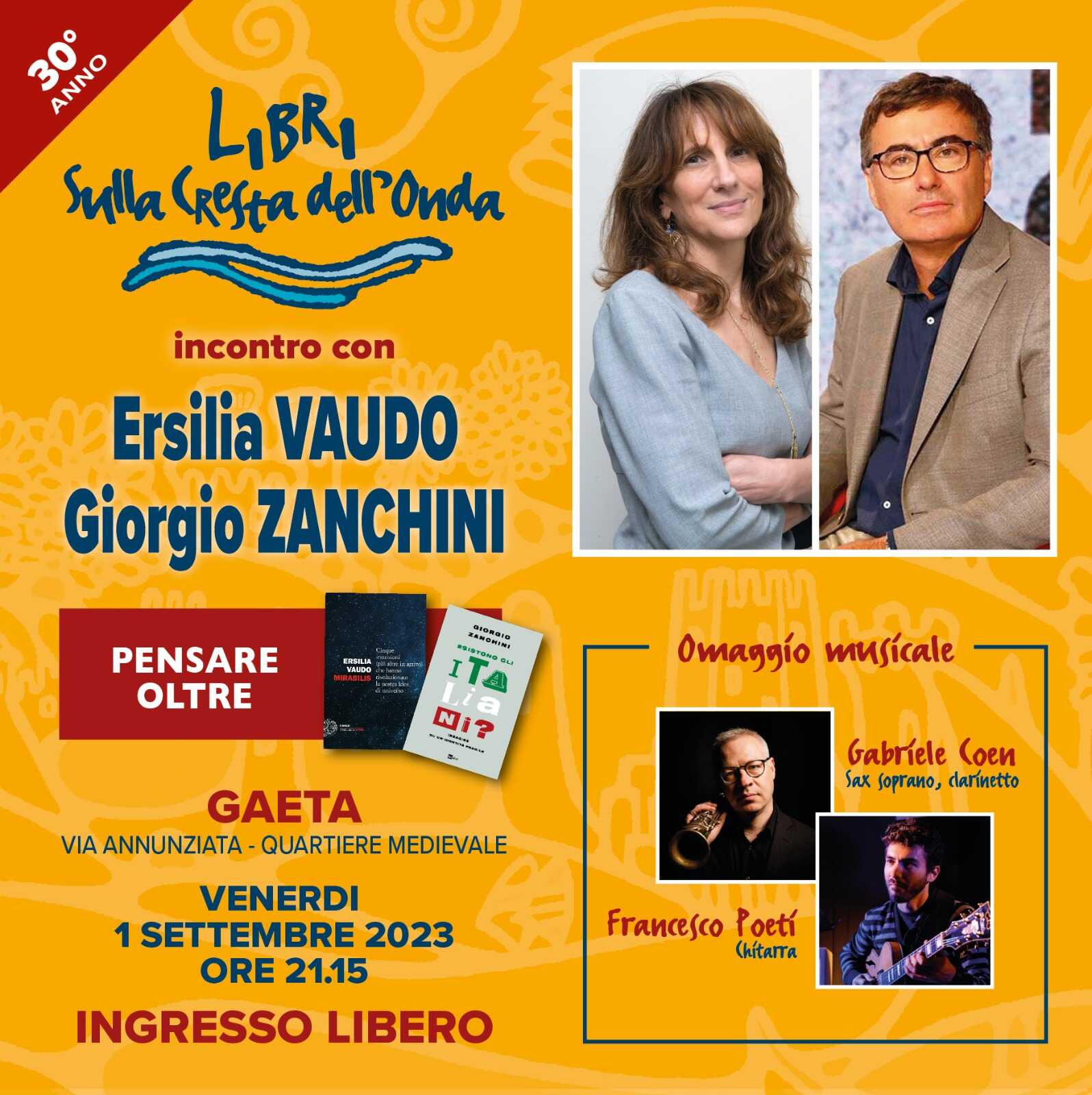 GAETA – La XXX edizione di Libri Sulla Cresta dell’Onda nel mese di settembre propone tre appuntamenti letterari di grande interesse a completamento della programmazione estiva. Dopo gli emozionanti incontri al Teatro romano di Minturno rispettivamente con Melania Mazzucco e Maurizio de Giovanni tenutisi a luglio e agosto che hanno visto la partecipazione di centinaia di lettori, si prosegue a Gaeta venerdì 1° settembre. Il Sagrato della Chiesa della SS. Annunziata ancora una volta si trasformerà in un vero salotto letterario con 1.000 posti a sedere. Protagonisti della serata saranno l’astrofisica ERSILIA VAUDO, autrice di “MIRABILIS, cinque intuizioni (più altre in arrivo) che hanno rivoluzionato la nostra idea di universo” ( Einaudi) e il giornalista e conduttore radiofonico e televisivo GIORGIO ZANCHINI che ha recentemente pubblicato per Rai Libri “ESISTONO GLI ITALIANI? Indagine su un’identità fragile”.