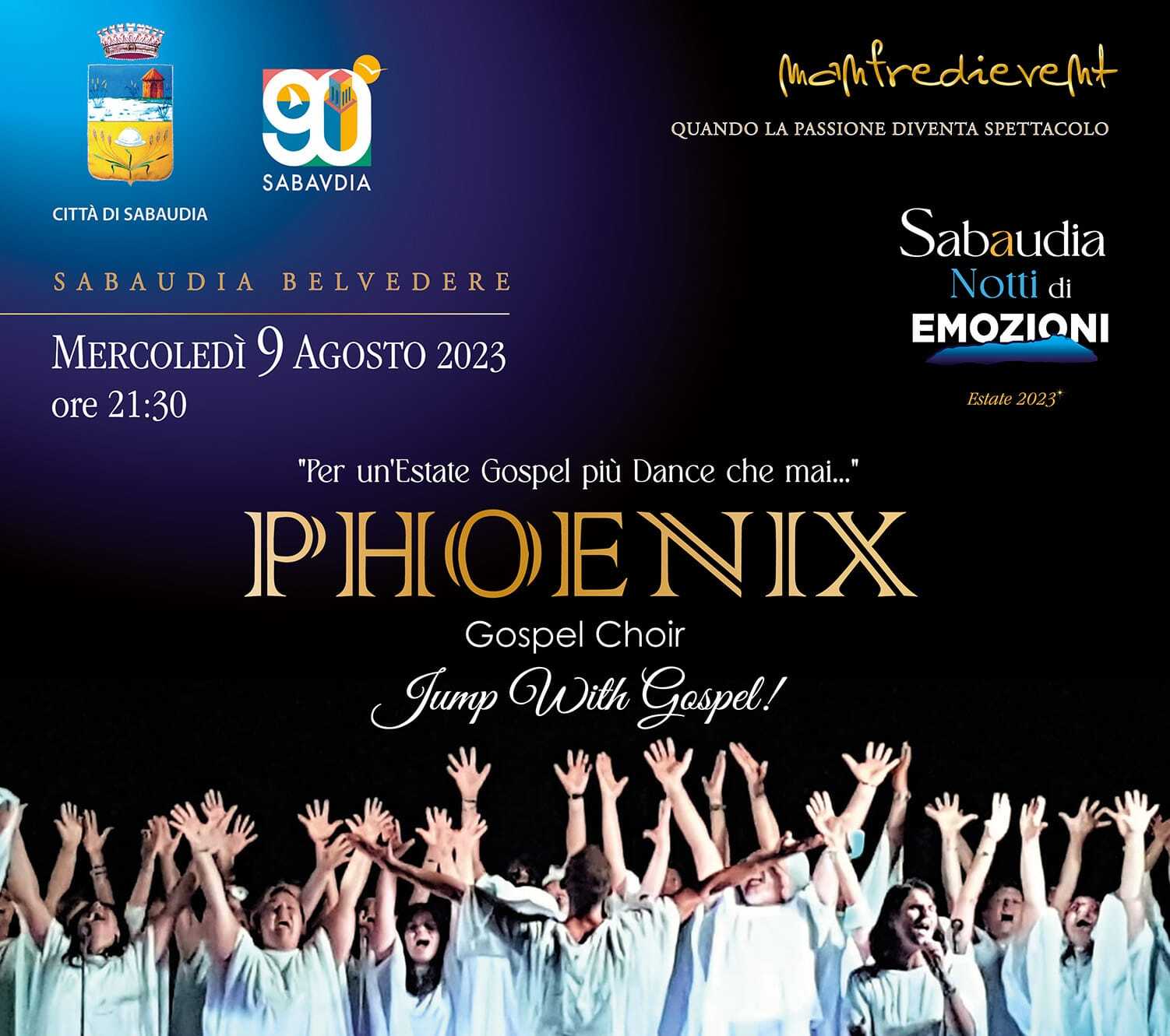 SABAUDIA – Si terrà venerdì 9 agosto alle 21,30 a Sabaudia, nell’ambito di Sabaudia Notti di emozioni, il concerto del Phoenix Gospel Choir dal titolo Jump with Gospel promosso dalla Manfredi Event con il patrocinio del Comune di Sabaudia in occasione del 90° della città.