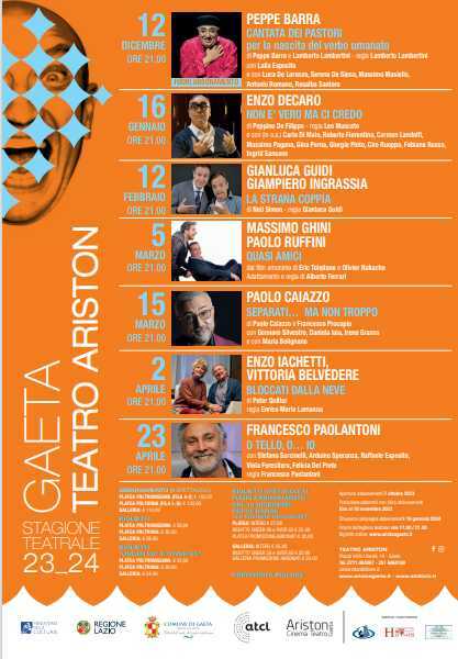 GAETA – Al via la nuova Stagione di prosa dello storico teatro Ariston di Gaeta, nata dalla collaborazione tra il Comune di Gaeta, l’ATCL Circuito multidisciplinare dello spettacolo dal vivo del Lazio, sostenuto da MIC – Ministero della Cultura e Regione Lazio, e il Cinema Teatro Ariston. Un progetto culturale articolato rivolto a varie tipologie di pubblico, dagli appuntamenti per famiglie, a spettacoli rivolti al mondo della scuola e una prestigiosa stagione di prosa con sette spettacoli serali, di cui uno fuori abbonamento, proposti da dicembre 2023 ad aprile 2024, con grandi nomi del panorama teatrale italiano, artisti autori e nuova drammaturgia.