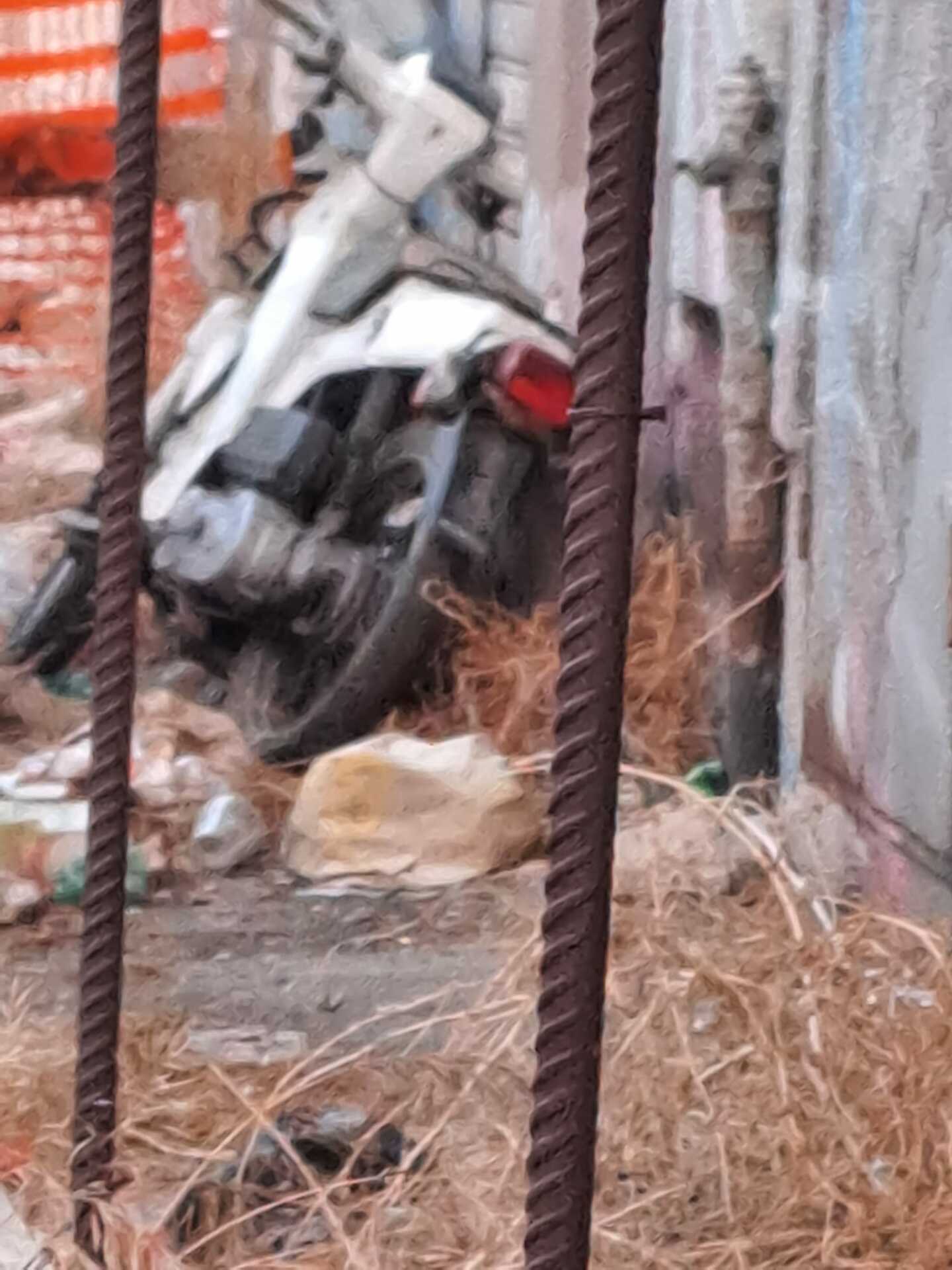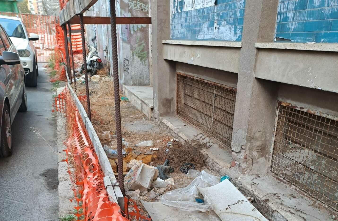 Il transennamento, che segnala il rischio di caduta dei calcinacci dalla facciata, ha creato in effetti uno spazio abbandonato dove giacciono rifiuti di ogni genere e anche anche ingombranti come è il caso dello scooter.