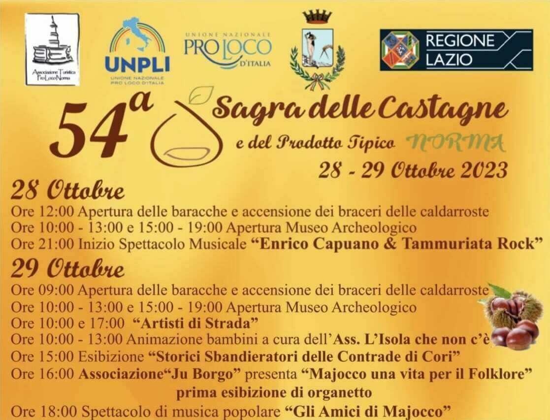 NORMA – Con l’autunno, torna a Norma, il 28 e 29 ottobre, la Sagra delle Castagne e del prodotto tipico, 54° edizione della festa popolare lepina dedicata al frutto del territorio. La manifestazione sarà inaugurata sabato 28 ottobre a mezzogiorno con l’accensione dei bracieri negli stand, per dare il via a un percorso enogastronomico che consentirà di provare varie specialità: oltre alla classica dalle caldarroste, gli altri piatti tipici cucinati secondo la tradizione.