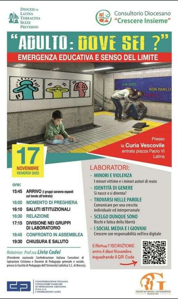 LATINA – Il Consultorio Diocesano familiare “Crescere Insieme”, in occasione dei 20 anni dalla sua costituzione, ha organizzato un convegno che si terrà il 17 novembre (alle 15.45) presso la Curia Vescovile di Latina (ingresso da piazza Paolo VI). Il tema trattato sarà “Adulto: dove sei? Emergenza educativa e senso del limite”. L’evento è destinato in modo particolare ad insegnanti, educatori, genitori e tutti coloro che svolgono una funzione educativa.
