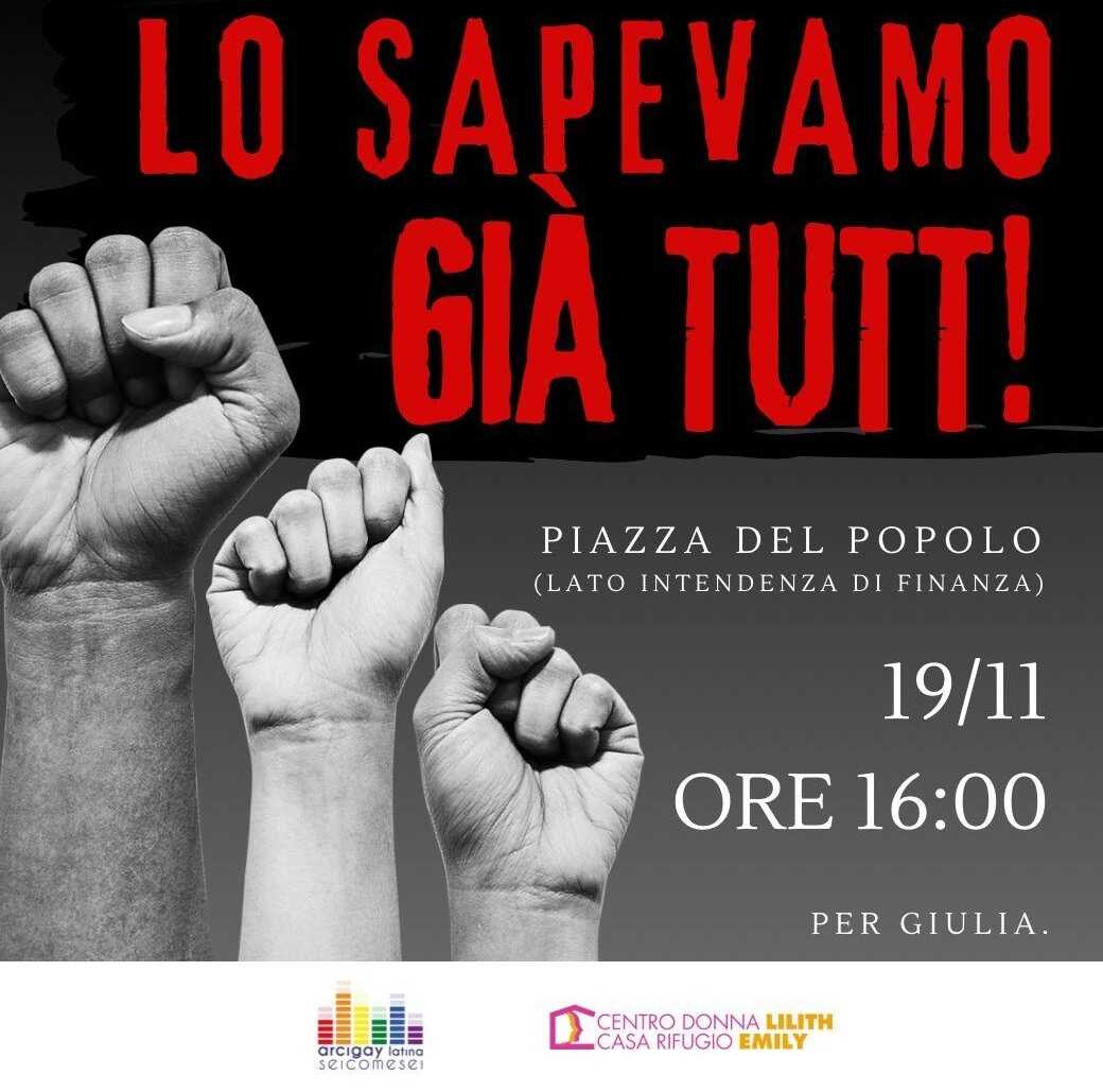 LATINA – Domenica alle 16.00 in Piazza del Popolo Arcigay Latina – Seicomesei e Centro Donna Lilith organizzano una manifestazione senza bandiere in memoria di Giulia Cecchettin la studentessa laureanda in ingenegneria barbaramente uccisa dall’ex ragazzo in provincia di Pordenone.