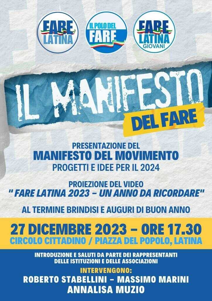 “Quello che sta per concludersi è stato un 2023 ricco di eventi, di appuntamenti importanti e anche di successi per tutto il gruppo di Fare Latina. Grande motivo di orgoglio è stato il fatto di aver contribuito alla elezione del nostro sindaco Matilde Celentano e di aver espresso un assessore all’interno della giunta. Oltre a guardare al futuro, l’evento del 27 dicembre servirà anche a ripercorrere tutte le tappe che hanno reso speciale questo 2023. Per questo motivo, verrà proiettato un video dal titolo “Fare Latina 2023 – Un anno da ricordare””, dicono Muzio e Stabellini.