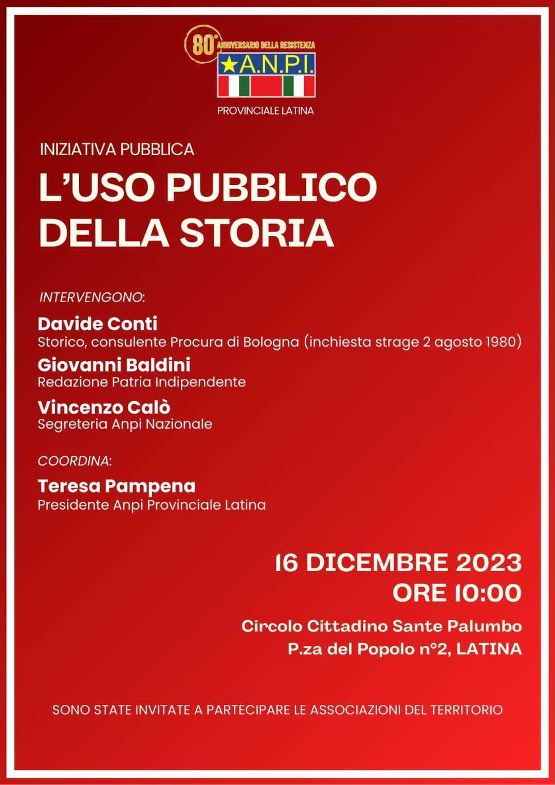 LATINA – Si intitola “L’uso Pubblico della storia” l’incontro promosso dall’Anpi di Latina per sabato 16 dicembre (alle 10) al Circolo Cittadino in piazza del Popolo. Intervengono, Davide Conti, storico e consulente della Procura di Bologna (inchiesta strage 2 agosto 1980), Giovanni Baldini, redattore del periodico Patria Indipendente e Vincenzo Calò della Segreteria ANPI Nazionale, coordinati dalla presidente ANPI Provinciale Latina, Teresa Pampena.