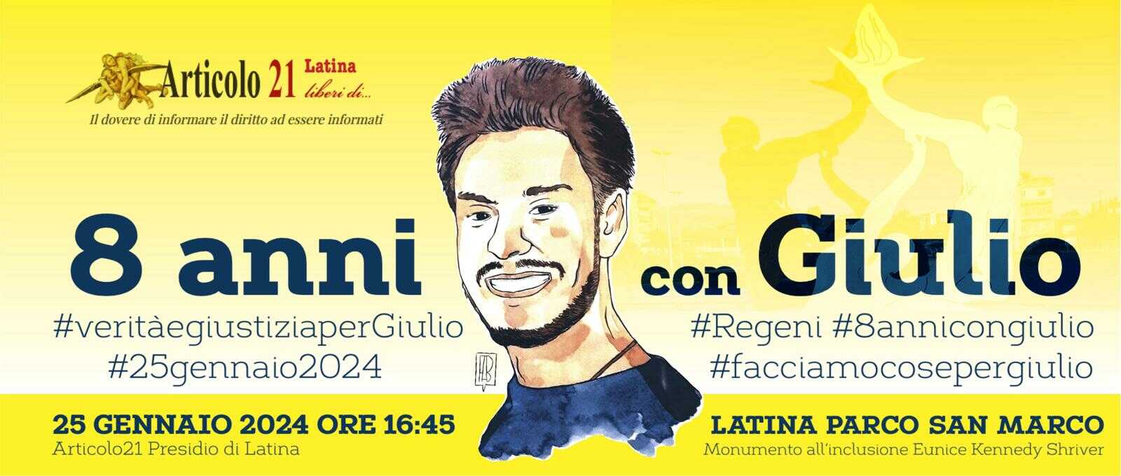 LATINA – Latina ricorda Giulio Regeni a 8 anni dalla sua barbara uccisione avvenuta a Il Cairo in Egitto, dopo che lo studente italiano, dottorando all’università di Cambridge, era stato sequestrato e torturato. Era il 25 gennaio del 2016. “Otto anni di instancabile ricerca di verità da parte della Famiglia Regeni e della legale Alessandra Ballerini. In questi lunghi anni attorno alla famiglia Regeni si sono stretti milioni di cittadini, il “popolo giallo” che ha fatto propria una battaglia in difesa dei diritti umani e dell’onore stesso del nostro Paese”, dicono gli attivisti che a Latina hanno scelto di chiedere verità e giustizia per Giulio. Saranno loro, anche quest’anno, in occasione dell’anniversario del rapimento di Giulio, a tenere una breve cerimonia di ricordo del ricercatore friulano aperta a tutta la cittadinanza.
