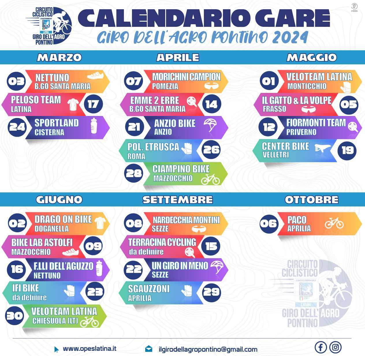 LE TAPPE – Si comincerà il 3 marzo con la tappa inaugurale a Borgo Santa Maria a cura della Asd Nettuno, il 17 marzo invece, il Peloso Team porterà il serpentone colorato a Latina. Ed ancora, il 24 marzo il l’asd Sportland andrà in scena in quel di Cisterna a chiusura del mese. Veniamo ad aprile dove il giorno 7, la Morichini Campion disputerà la sua corsa a Pomezia. Il 14 aprile il team della Emme 2 Erre ci accompagnerà con la corsa a Borgo Santa Maria. Si prosegue il 21 aprile ad Anzio, con la gara dell’Anzio Bike. Il 26 in scena la new entry Polisportiva Etrusca con tappa nella città capitolina. La Ciampino Bike chiude il mese a Mazzocchio il 28. Maggio si apre con il Veloteam Latina a Monticchio il 1, mentre il 5 il Gatto&La Volpe porterà il gruppo in località Frasso. Ed ancora il 12 maggio con il Fiormonti Team si gareggerà a Priverno, mentre il 19 a Velletri con la Center Bike. Giugno, si apre con la tappa festiva del 2, condotta dalla Drago On Bike a Doganella. Il 9 il plotone si sposta a Mazzocchio con la Bike Lab Astolfi. Il 16 a Nettuno con un’altra new entry, i Fratelli Dell’Aguzzo ed il 23 con altra nuova società del giro la Ifi Bike con tracciato da definire. Si chiude la stagione con la pausa estiva il 30 in località Chiesuola con il Veloteam Latina. Si torna in sella l’8 settembre e Sezze con il Team Nardecchia Montini, il 15 sarà la volta della Terracina Cycling con percorso in definizione ed il 22 ancora Sezze protagonista con la nuova arrivata Un Giro In Meno. Colpo di coda con un’altra nuova società, la Sgauzzoni ad Aprilia in programma il 29. Unica tappa di ottobre il giorno 6, con Paco sempre ad Aprilia.