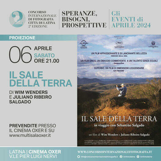 Al via intanto gli eventi collaterali e sabato 6 aprile si terrà al Cinema Oxer la proiezione de “Il sale della terra” il documentario di Wim Wenders e Juliano Ribeiro Salgado che ritrae le opere e la vita del grande fotografo brasiliano Sebastião Salgado: interrogato dallo sguardo fuori campo di Wim Wenders, straordinario ritrattista, e accompagnato sul campo dal figlio, Juliano Ribeiro Salgado, l’artista si racconta attraverso i reportages che hanno omaggiato la bellezza del pianeta e gli orrori che hanno oltraggiato quella dell’uomo. Salgado, il più grande fotografo dei nostri tempi, ha attraversato il mondo permettendoci di toccare con mano le questioni del pianeta, gli errori dell’uomo, l’incanto della natura. Il film, che ha ottenuto una candidatura al Premio Oscar, una candidatura al David di Donatello e ha vinto un premio ai Cesar, è uscito nel 2014: sabato 6 aprile si celebreranno, quindi, i primi 10 anni di questo commovente poema visivo, “un colpo al cuore e alla coscienza”.
