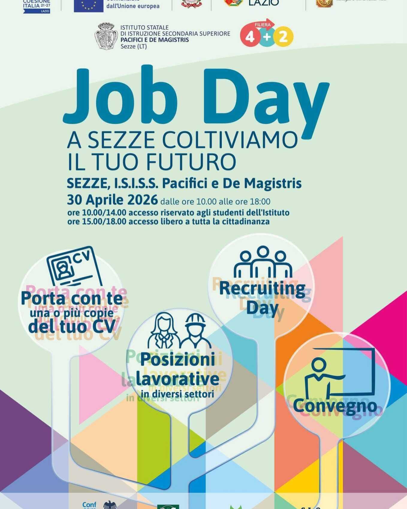 L’evento nasce dalla collaborazione tra il Comune di Sezze e l’ISISS Pacifici e De Magistris, con il supporto del Coordinamento dei Centri per l’Impiego della Regione Lazio, Confcommercio Lazio Sud, Cooperativa Progetto 2000 e Mediaquattro ETS. In particolare, l’ISISS “Pacifici e De Magistris” ha inserito a pieno titolo il Job Day all’interno della propria programmazione ufficiale delle attività di orientamento in uscita e promozione dei percorsi quadriennali della filiera tecnologica-professionale 4+2, riconoscendone l’alto valore formativo per gli studenti. Questo evento costituisce per l’istituto il naturale sviluppo di una strategia di orientamento in uscita e di consolidamento dei legami della scuola con il tessuto imprenditoriale locale. Tale strategia è pienamente allineata con la recente riforma degli istituti tecnici e, in particolare, con le direttive ministeriali relative alla filiera 4+2.
