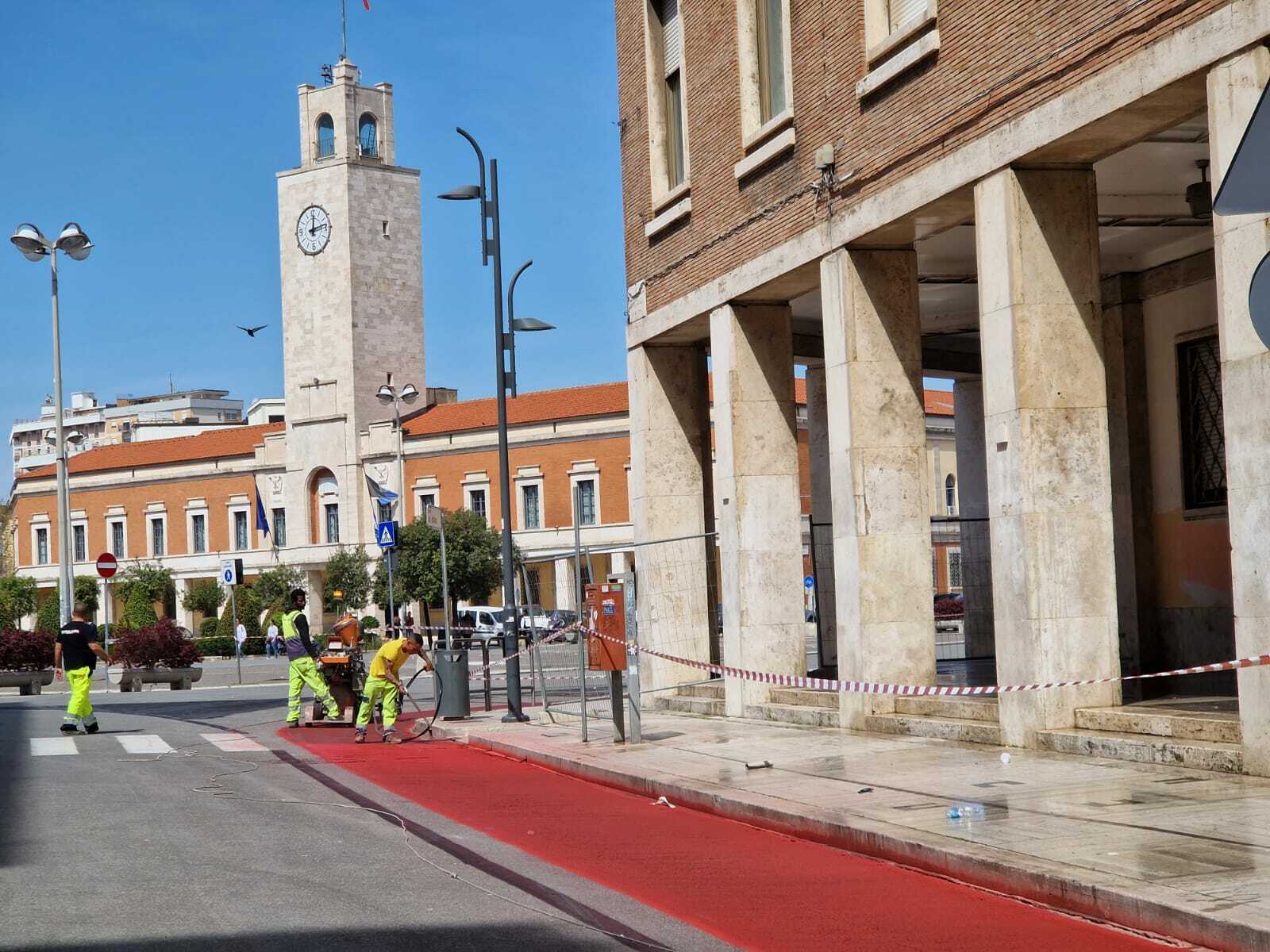LATINA – Mentre sono in corso tra Piazza del Popolo e Via Diaz i lavori per la realizzazione della nuova segnaletica stradale dopo la riapertura infrasettimanale del tratto ora escluso dal perimetro dell’area green, spunta un nuovo tratto di pista ciclabile segnalato dall’asfalto rosso realizzato proprio questa mattina. Come era naturale, congiungerà Corso Matteotti a Via Diaz (passando appunto da Piazza del Popolo), ricucendo i due tratti già esistenti nel centro storico. Si potranno così mettere in sicurezza le bicilette ora che le auto ricominceranno a transitare dal lunedì al venerdì sera in un’area chiusa da dieci anni. Accanto verranno segnalati i parcheggi a disco orario.
