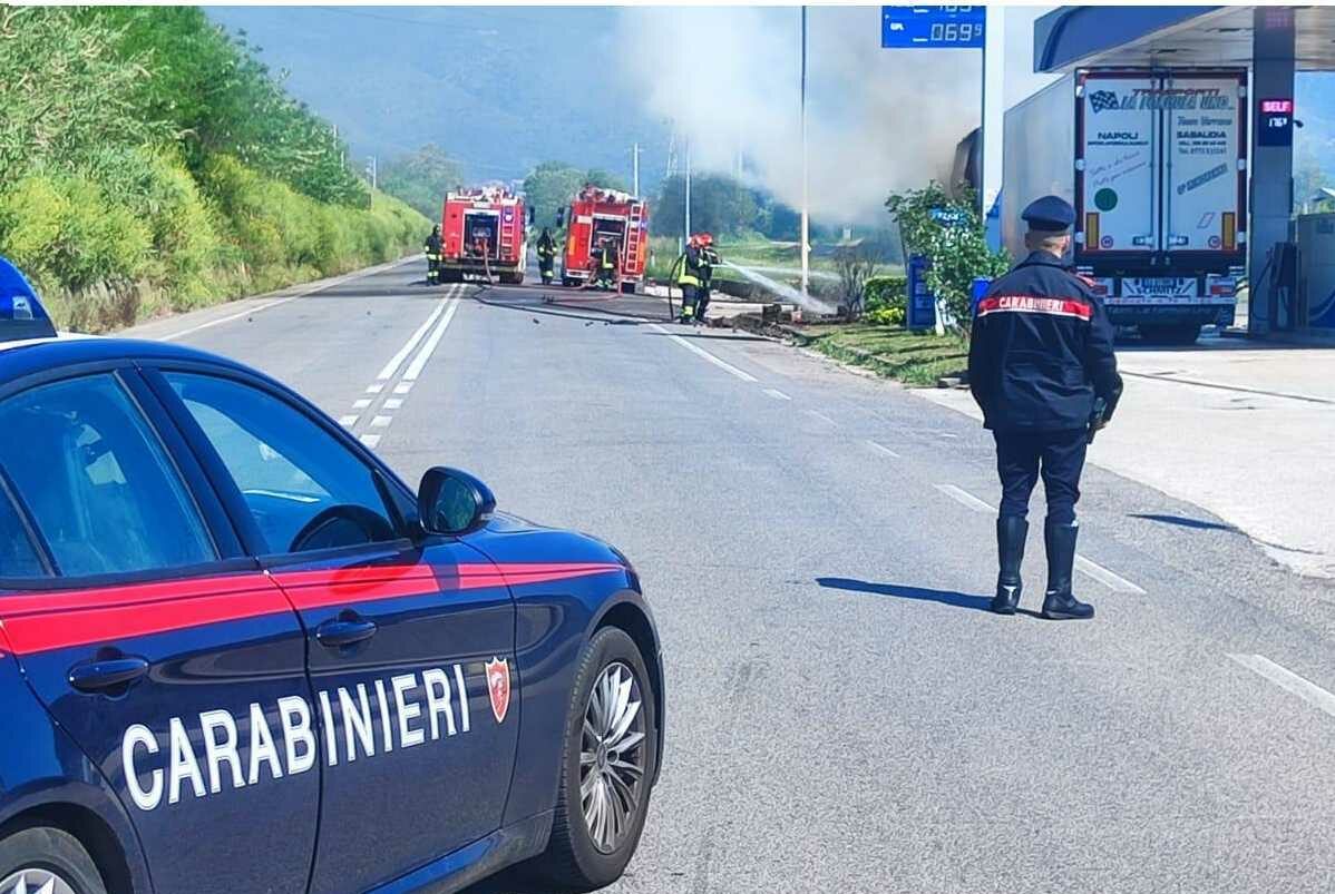 PROSSEDI – Paura nel pomeriggio di domenica in una giornata di esodo verso le località di mare della costa pontina per un tir frigorifero carico di alimenti andato distrutto da un incendio, strada chiusa e traffico in tilt. sulla statale Monti Lepini al chilometro 20,350 nel territorio del comune di Prossedi le fiamme sono divampate a bordo di un autoarticolato che trasportava mele probabilmente a causa di corto circuito, l’autista ha fatto in tempo ad accostare ha visto le fiamme ed è sceso rapidamente salvandosi la vita. Soccorso dai titolari del bar nelle vicinanze che hanno dato l’allarme al 112 mentre sul posto sono arrivati i carabinieri e i vigili del fuoco che hanno domato l’incendio. Durante le operazioni un pompiere è rimasto ferito dalla manichetta antincendio dell’autobotte ed stato visitato e medicato all’ospedale Fiorini di Terracina con una prognosi di 7 giorni.