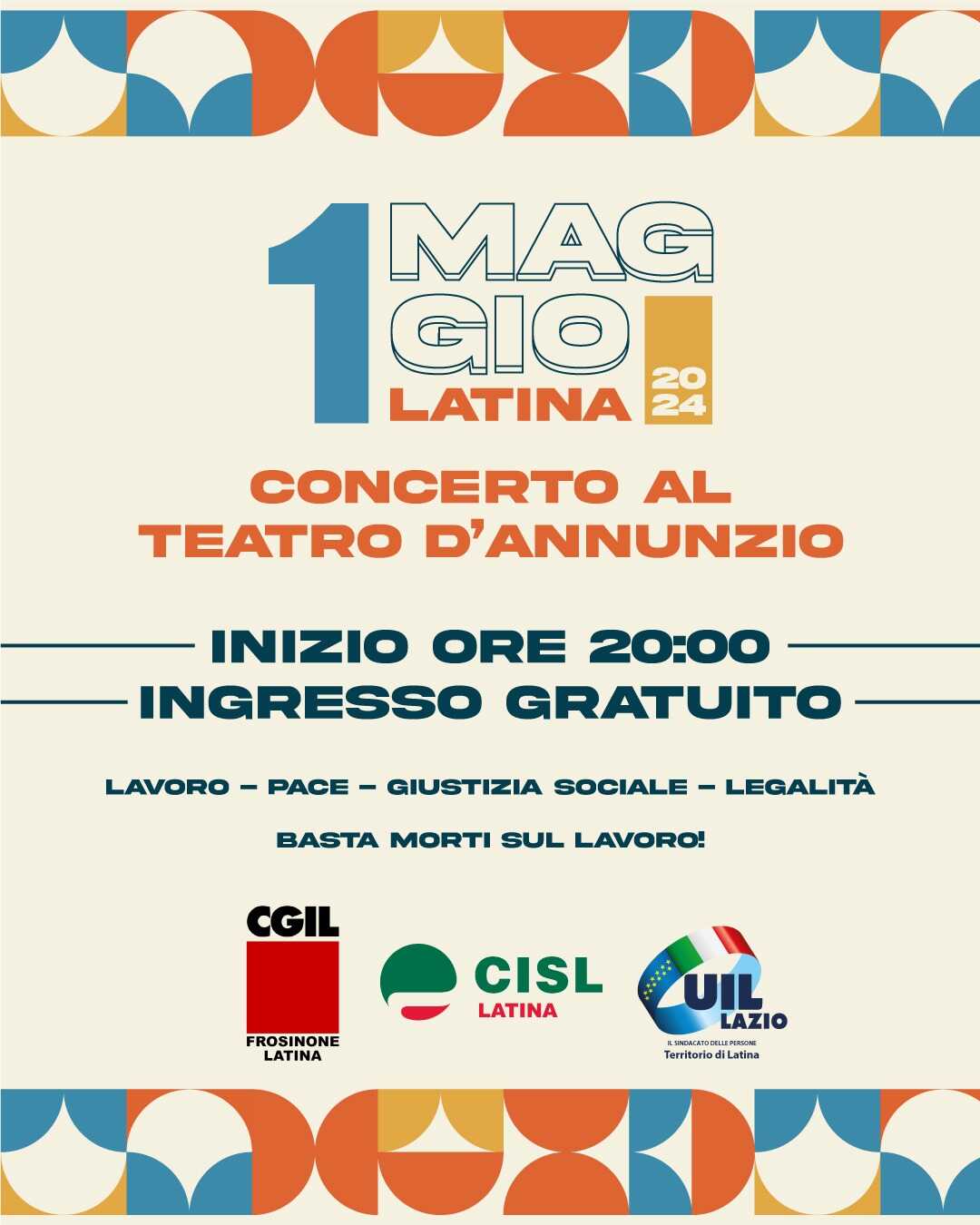 LATINA – Lavoro, pace, giustizia sociale, legalità e basta morti sul lavoro. Sono i temi del Primo Maggio, la festa nata per “celebrare il lavoro e rivendicare i diritti”. “Il Primo Maggio conserva la sua peculiarità un momento di unità e solidarietà per continuare ad affermare l’importanza del lavoro e dei diritti dei lavoratori e della loro sicurezza quotidiana in un mondo in continua evoluzione. Chiediamo lavoro sicuro e dignitoso e lo ribadiremo lasciando spazio alla musica di tanti giovani artisti con l’obiettivo di creare un momento di cultura, arte e riflessione”, dicono i segretari generali di Cgil, Cisl e Uil di Latina, Giuseppe Massafra, Roberto Cecere e Luigi Garullo che saranno presenti stasera al teatro D’Annunzio di Latina (dalle 20) dove, visto il maltempo, si è spostato il concerto celebrativo della giornata (l’ingresso è libero fino a esaurimento posti).