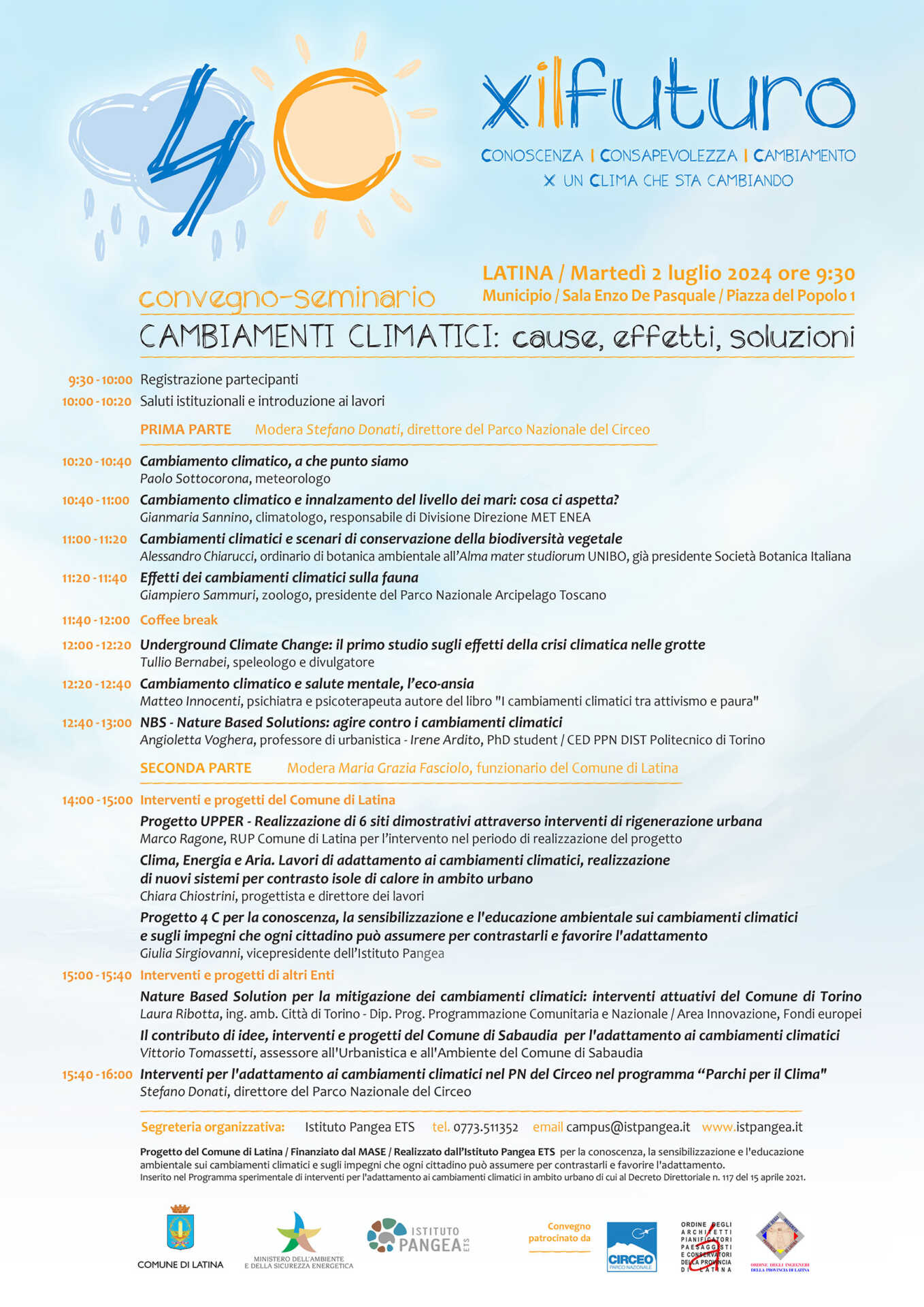 LATINA – Martedì 2 luglio, a partire dalle ore 9.30 nella sala De Pasquale si svolgerà un convegno-seminario dal titolo “Cambiamenti climatici: cause, effetti, soluzioni”. L’evento del Comune di Latina finanziato dal Ministero dell’Ambiente e della Sicurezza Energetica e realizzato dall’Istituto Pangea ETS, ha il patrocinio dell’ordine degli architetti e dell’ordine degli ingegneri della provincia e del Parco nazionale del Circeo. Interverranno la sindaca Matilde Celentano, il vicesindaco e assessore ai Lavori pubblici Massimiliano Carnevale, il direttore del Parco nazionale del Circeo Stefano Donati, esperti di livello nazionale e referenti di altri comuni italiani tra cui Paolo Sottocorona, Gianmaria Sannino, Alessandro Chiarucci, Giampiero Sammuri , Tullio Bernabei , Matteo Innocenti, Angioletta Voghera, Marco Ragone, Chiara Chiostrini, Giulia Sirgiovanni, Laura Ribotta, Vittorio Tomassetti.
