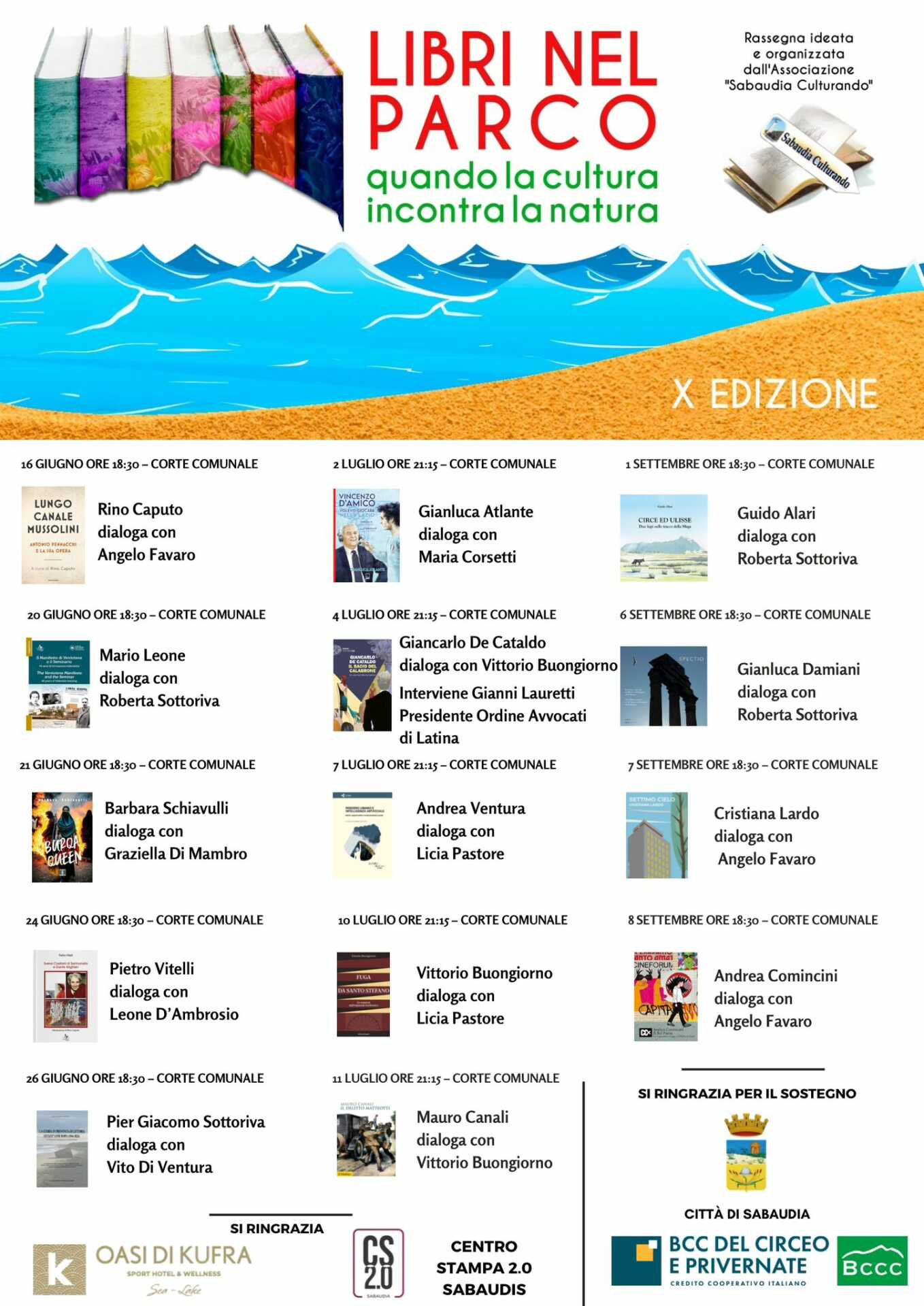 SABAUDIA – La rassegna letteraria Libri nel Parco compie i suoi primi dieci anni e presenta un cartellone di 16 incontri, da metà giugno fino alla prima settimana di settembre con una pausa nel mese di agosto, per accompagnare la stagione balneare di residenti e turisti appassionati di libri e cultura. Tanti incontri con gli autori, una grande varietà di proposte tra le quali alcune “prime” , mancherà invece in apertura della manifestazione l’incontro ormai tradizionale con la scrittrice e cittadina onoraria di Sabaudia Dacia Maraini, impegnata all’estero (il suo incontro sarà spostato in autunno). La manifestazione prenderà il via domenica 16 giugno.