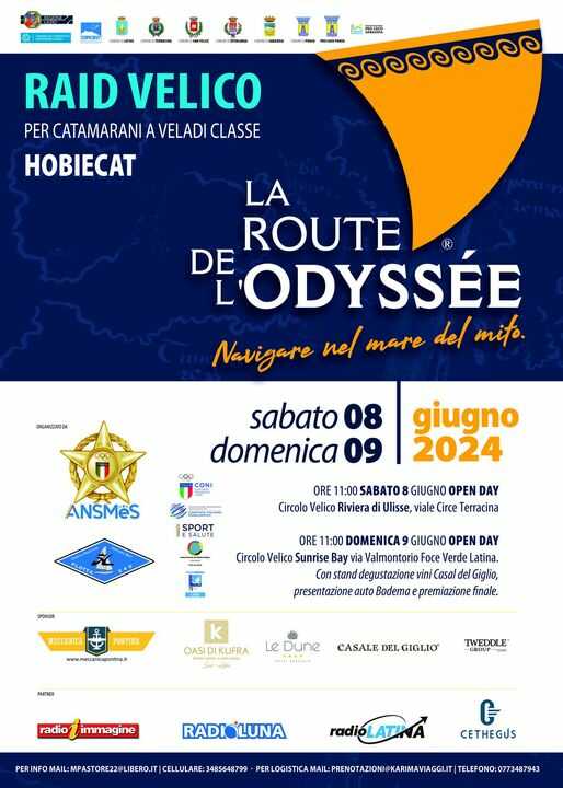 LATINA – Tutto pronto per la Route de l’Odyssée. Navigare nel mare del Mito promossa Associazione Nazionale Stelle, Palme e Collari d’Oro al Merito Sportivo – Associazione Benemerita riconosciuta dal CONI e dal CIP, con la partecipazione di numerosi circoli velici, da Sperlonga a Torvaianica. Una due giorni in programma l‘8 e il 9 giugno che vedrà impegnata una flotta di 32 catamarani della classe HobbieCat su un percorso a triangolo disegnato tra Terracina, Ponza e Latina Lido.