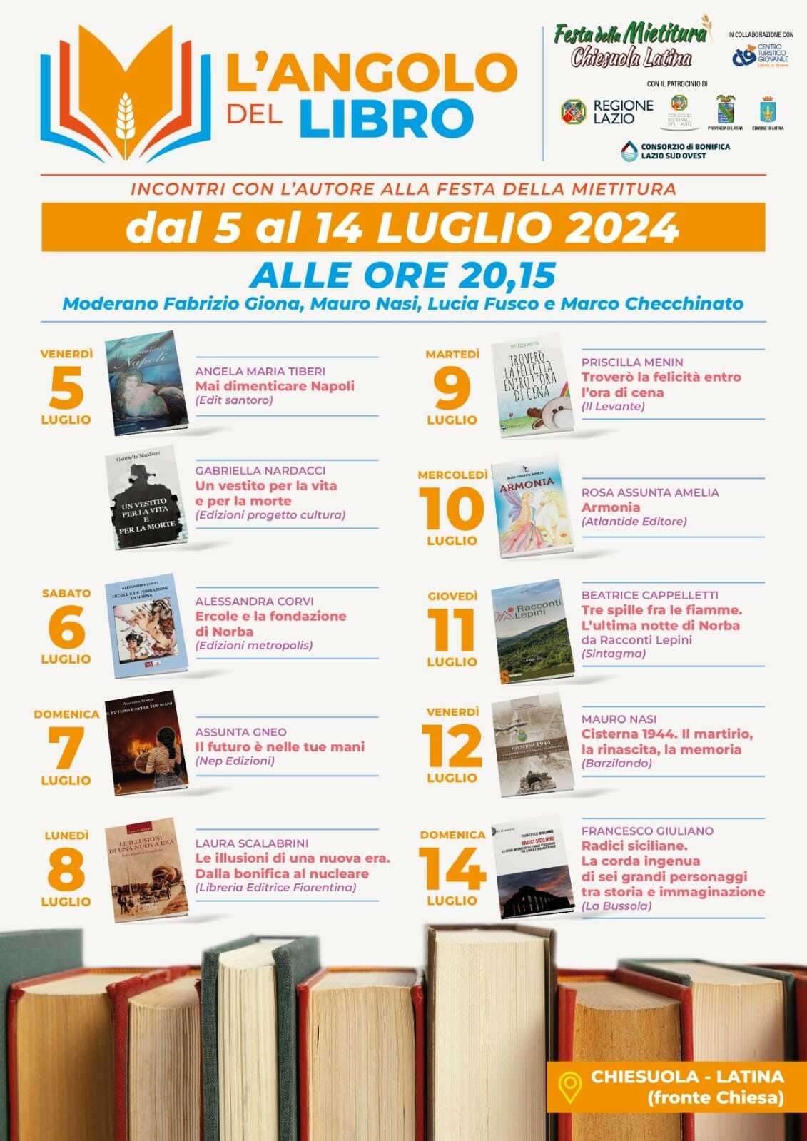 LATINA – Torna il salotto letterario “L’Angolo del Libro. Incontri con l’autore alla Festa della Mietitura”: da domani (5 luglio) e fino a domenica 14 luglio, dieci autori si alterneranno sul palco della manifestazione di Chiesuola dalle 20.15 presentati da Fabrizio Giona, Mauro Nasi, Lucia Fusco e Marco Checchinato, avendo a disposizione poco più di 20 minuti per raccontare storie e personaggi dei luoghi pontini narrati, ma anche vicende che nascono e si sviluppano altrove, pur avendo nelle vene sangue pontino.