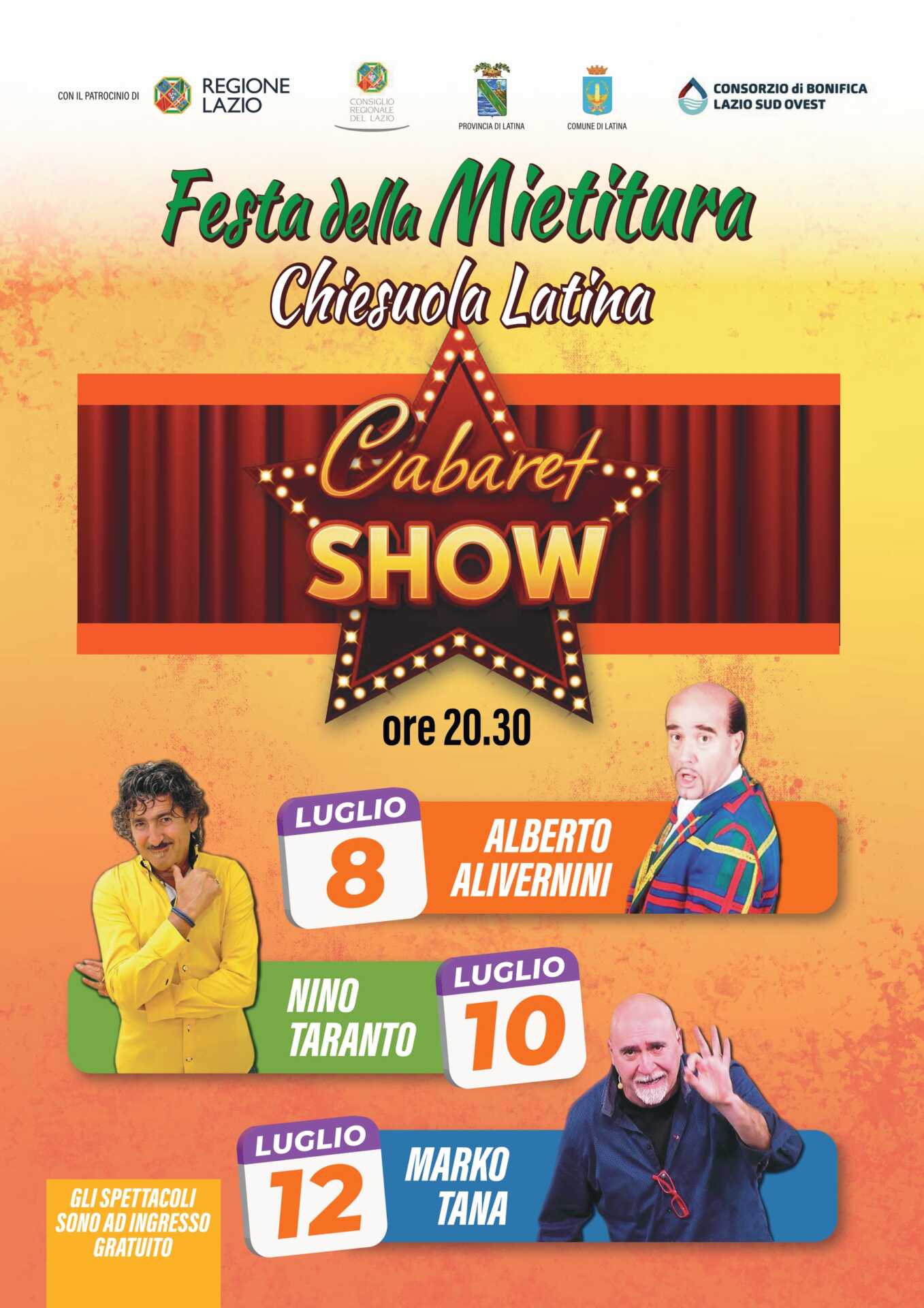 LATINA – Prima serata con il cabaret stasera, 8 luglio, alla Festa della Mietitura di Chiesuola dove torna protagonista la risata. L’8, il 10 e il 12 luglio, alle ore 20.30, va in scena “Cabaret Show”, tre serate ad ingresso libero e gratuito che in questa ottava edizione della kermesse pontina vedranno sul palcoscenico Alberto Alivernini, Nino Taranto e Marko Tana.