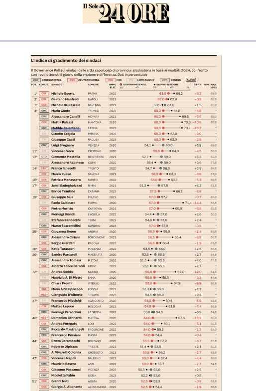Per dovere di cronaca, la classifica dice anche che dal giorno dell’elezione ad oggi, la sindaca di Latina è passata dal 70,8% di gradimento all’attuale 60% (con un -10,8 %).