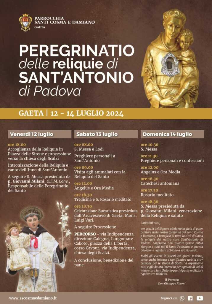 GAETA – In questi giorni, dal 12 al 14 luglio, Gaeta sarà meta della Peregrinatio delle Reliquie di S. Antonio di Padova. Quelle , arriveranno a Gaeta sono due: quella contenuta nel busto è una parte mummificata del corpo del santo, la seconda posta in un reliquiario consiste in un frammento osseo della costola più piccola, la costola fluttuante, quella più vicina al cuore di Sant’Antonio. A Gaeta c’è sicuramente tanta attesa per l’evento: «La Peregrinatio – commenta il sindaco della città Cristian Leccese – potrà essere un’opportunità intensa di condivisione e unione, grazie al previsto programma, per riaccendere la fede e lasciarsi incoraggiare dall’esempio di S. Antonio, per affrontare le difficoltà di tutti i giorni e vivere la carità con slancio e spirito cristiano. Sono convinto che la nostra comunità accoglierà con fervore le Reliquie e vivrà questi giorni con devozione e spiritualità. Voglio ringraziare Don Giuseppe Rosoni e la Parrocchia dei Santi Cosma e Damiano, Padre Giovanni Milano responsabile della Peregrinatio per aver favorito questo importante evento che contribuirà a rendere ancora attuale e visibile la missione evangelizzatrice che il Santo dei miracoli ebbe durante la sua vita».