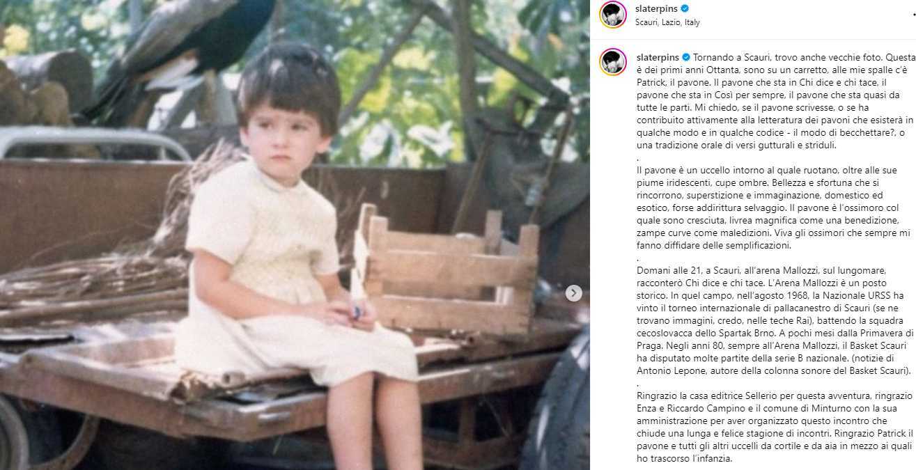 Intanto, anticipando qualcosa della chiacchierata di stasera, in cui racconterà Chi dice e chi tace (Sellerio, pagg. 271, €15), l’autrice, in un post su Instagram, pubblica una foto di lei bambina: “Tornando a Scauri – scrive – trovo anche vecchie foto. Questa è dei primi anni Ottanta, sono su un carretto, alle mie spalle c’è Patrick, il pavone. Il pavone che sta in Chi dice e chi tace, il pavone che sta in Così per sempre, il pavone che sta quasi da tutte le parti”.