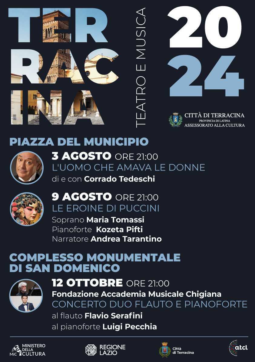 TERRACINA – All’interno del processo di valorizzazione culturale e turistica avviato dall’Assessorato alla Cultura della Città di Terracina, l’Amministrazione e ATCL, circuito multidisciplinare del Lazio sostenuto da MIC – Ministero della Cultura e Regione Lazio, propongono tre eventi di grande livello con performance di teatro e musica. Il primo appuntamento è in programma sabato 3 agosto alle ore 21:00 nella splendida cornice di Piazza Municipio, dove ad esibirsi sarà Corrado Tedeschi con il suo spettacolo “L’uomo che amava le donne”.