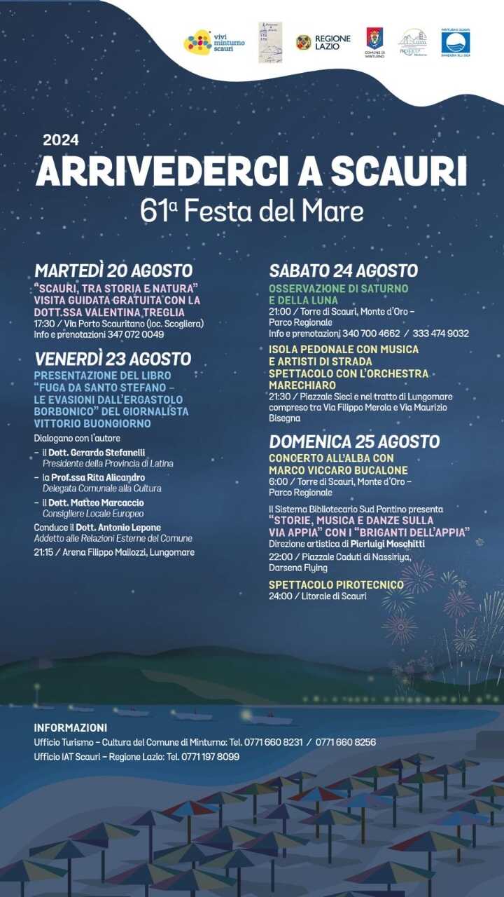 Alle 22 di domenica 25 agosto, nel Piazzale Caduti di Nassiriya (Darsena Flying), il sipario si alzerà sulla musica con lo spettacolo “Storia, musiche e danze sulla Via Appia” con il gruppo “I Briganti dell’Appia”, proposto dal Sistema Bibliotecario Sud Pontino e con la direzione artistica di Pierluigi Moschitti, mentre, alle ore 24, un suggestivo spettacolo pirotecnico sulla spiaggia del “Lido del Pino”, a cura della ditta “Big Party” di Castelforte, chiuderà la 61^ Festa del Mare “Arrivederci a Scauri”.